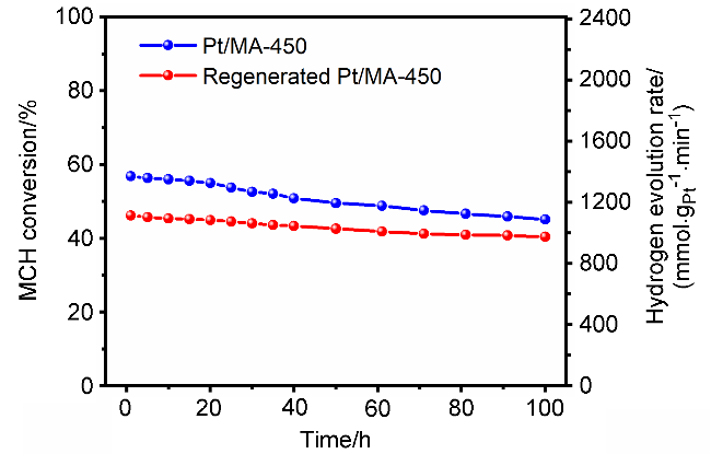 表1 催化剂Pt/MA-450与文献报道的负载型Pt基催化剂MCH脱氢活性对比Table 1 Comparison of catalyst Pt/MA-450 with previous reported Pt-based catalysts for MCH dehydrogenation reaction |