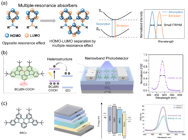 图3 (a)硼氮掺杂多重共振体系的分子设计策略和性质特点; (b)基于MR分子的窄谱带光晶体管及其光谱选择性探测性能[41]; (c)基于MR分子的窄谱带光二极管及其光谱选择性探测性能[42]Figure 3 (a) Molecular design strategies and property characteristics of boron/nitrogen doped multiple-resonance systems. (b) Narrowband phototransistors based on MR molecules and their spectral selective detection performance[41]. Copyright 2025 Wiley-VCH. (c) Narrowband photodiode based on MR molecules and its spectral selective detection performance[42]. Copyright 2024, Wiley-VCH |