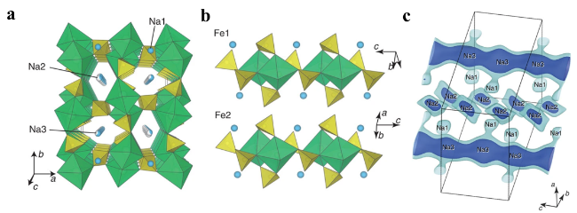 图8 (a) Na2FeM(SO4)3的前三圈的放电曲线以及NFS的循环性能; (b)充电/放电期间测量的开路电压(电流速率C/50)和第一次充电期间的钠离子扩散系数[58]Figure 8 Discharge curves for the first three cycles of Na2FeM(SO4)3 and cycling performance of NFS. (b) Open circuit voltage measured during charging/discharging (current rate C/50) and the sodium ion diffusion coefficient during the first charging[58] |