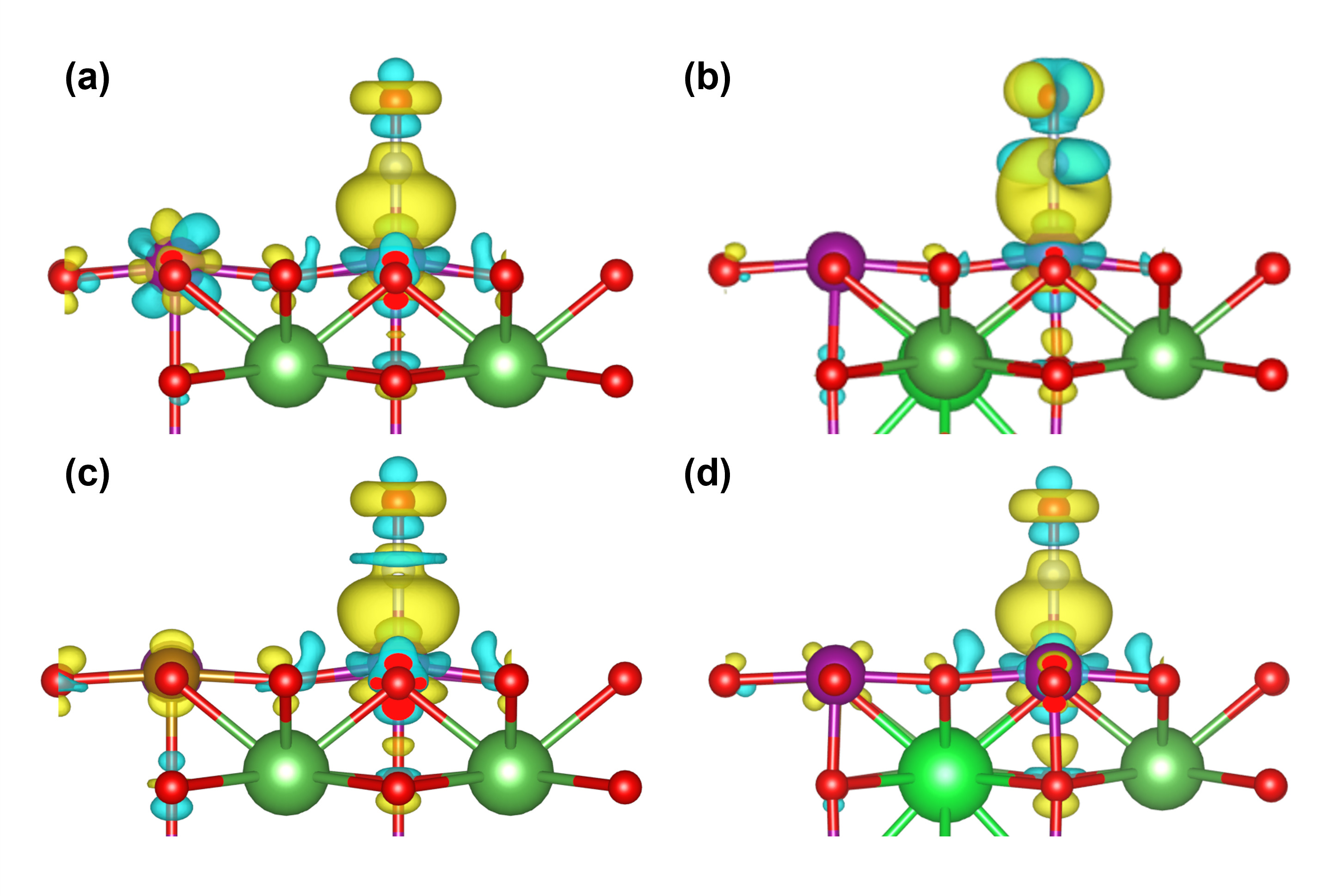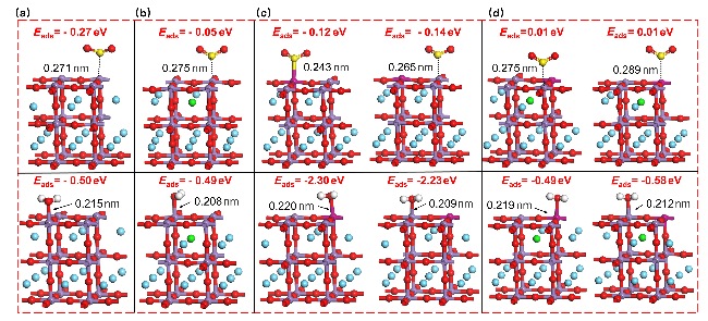 图6 NO在LaMnO3掺杂体系表面的吸附构型Figure 6 Adsorption configuration of NO on the surface of LaMnO3 doped system (a) LaMnO3, (b) LaSrMnO3, (c) LaMnFeO3, (d) LaSrMnFeO3. |