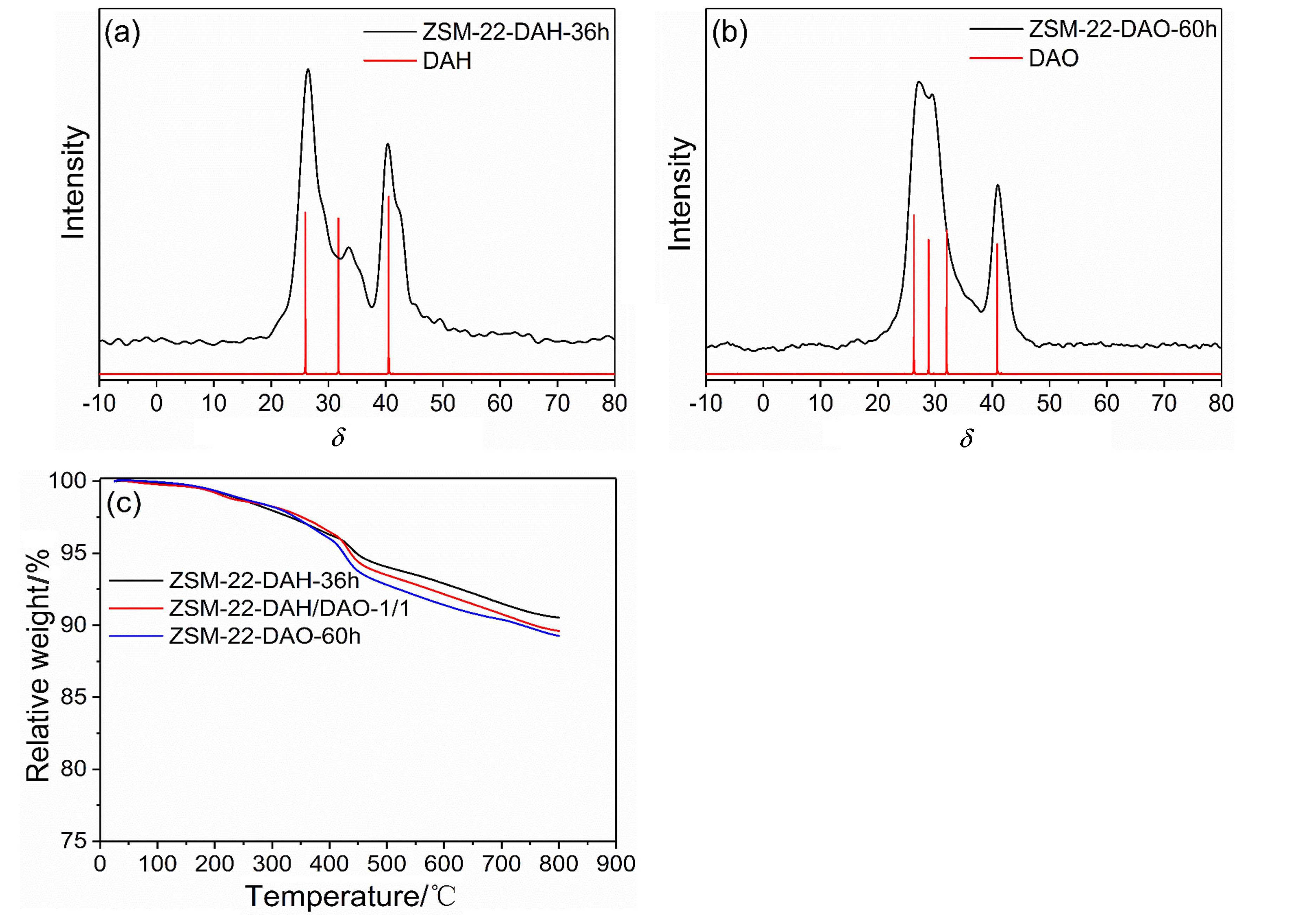 图7 各种ZSM-22分子筛的13C MAS NMR谱图(a, b)及热重失重曲线(c)Figure 7 13C MAS NMR spectra (a, b) and thermogravimetric weight loss curves (c) of various ZSM-22 zeolites |