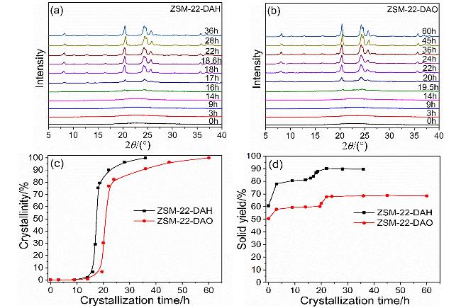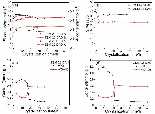 图6 不同晶化时间后的ZSM-22-DAH和ZSM-22-DAO分子筛中Si、Al含量(a)、Si/Al比(b)以及有机模板剂和K含量(c, d)Figure 6 The Si and Al contents (a), Si/Al ratios (b), as well as the contents of the organic template agents and potassium (c, d) in ZSM-22-DAH and ZSM-22-DAO zeolites collected after crystallization for different times |