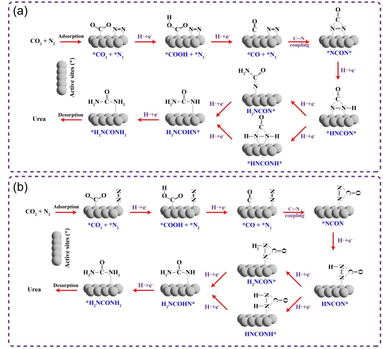 图9 通过CO2和N2机械化学合成尿素的不同机理及其中间物. 从CO2生成*CO的途径, N2以(a)侧向吸附或(b)端向吸附[52]. 路径中的H•和e-代表机械能诱导的活性氢与局域电子, 由H2O裂解及缺陷位点提供, 非电化学过程Figure 9 Different mechanisms of mechanochemical urea synthesis from CO2 and N2 and corresponding intermediate: the formation pathway of *CO from CO2, the adsorption way of N2 via (a) side-on and (b) end-on[52]. The H• and e- present in the pathway denote mechanically induced active hydrogen species and localized electrons, originating from water (H2O) splitting and defect sites, respectively; this mechanism operates independently of electrochemical processes |