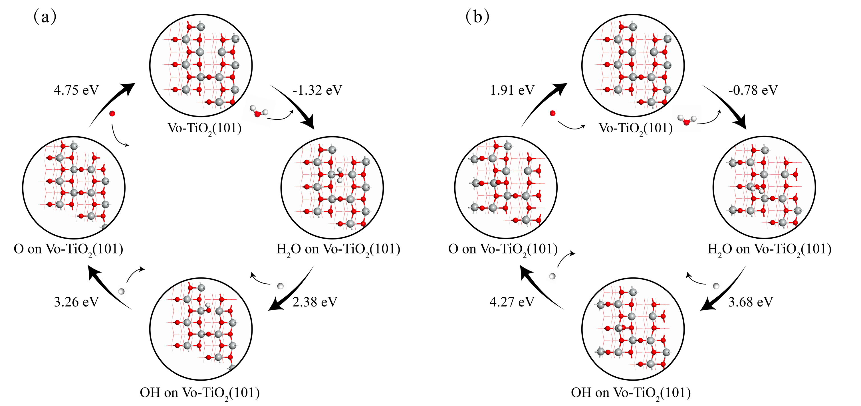 图12 H2O在Vo-TiO<H2O在Vo-TiO2 (101)表面的化学吸附和解离(每一步的形成能在图中已标出). (a)邻近Vo的Ti位点, (b)远离Vo的Ti位点(灰色小球代表Ti, 红色小球代表O, 白色小球代表H)Figure 12 The pathway of H2O molecules chemisorbed and dissociated on the Vo-TiO2 (101) surface (Each step has its corresponding formation energy value marked). (a) Ti sites adjacent to Vo, and (b) Ti sites away from Vo (grey balls represent Ti, red balls O, white balls H) |