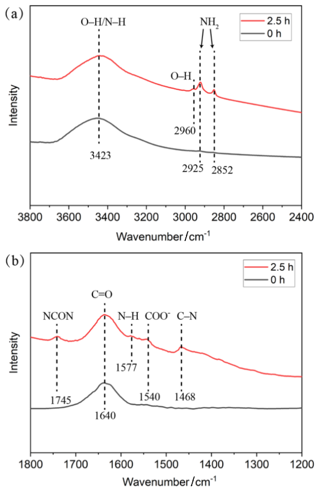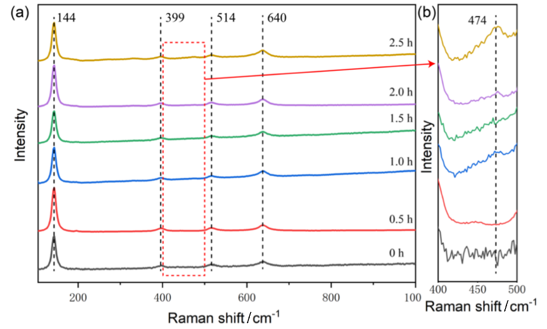 图6 机械球磨合成尿素0, 0.5, 1.0, 1.5, 2.0, 2.5 h TiO2的(a)拉曼光谱和(b) 400 cm-1到500 cm-1处的局部放大图(650 r/min, 70 g磨球)Figure 6 (a) Raman spectra and (b) local magnification in the range of 400 cm-1 to 500 cm-1 of solid powders obtained after mechanical ball milling synthesis of urea for 0, 0.5, 1.0, 1.5, 2.0, and 2.5 h (650 r/min, 70 g grinding balls) |