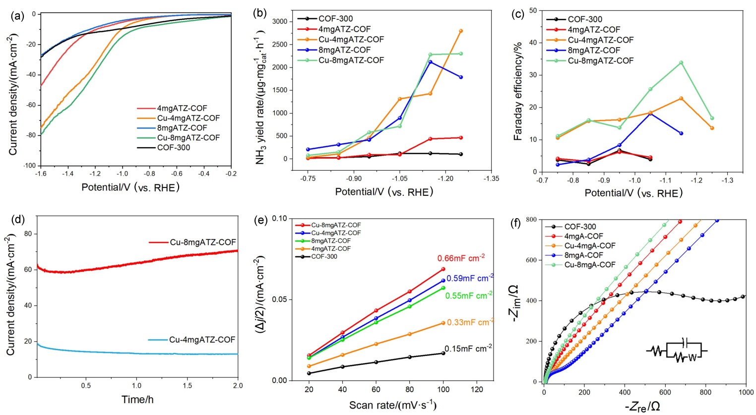 图3 (a)各催化剂在$N{\text{O}}_{3}^{-}$电解液中的线性扫描伏安曲线(LSV); (b)在-0.75 V至-1.25 V (vs. RHE)电位区间内, 不同催化剂的氨产率对比; (c)在相同电位范围内, 各催化剂的法拉第效率对比; (d) Cu-4mgATZ-COF和Cu-8mgATZ-COF的时间-电位稳定性测试曲线; (e)各样品的双电层电容(Cdl)测试结果; (f)各催化剂的电化学阻抗谱(EIS), 插图为拟合的等效电路模型Figure 3 (a) LSV curves of COF-300, 4mgATZ-COF, 8mg ATZ-COF, Cu-4mgATZ-COF and Cu-8mgATZ-COF. (b) The NH3 yield of all catalysts at -0.75 V to -1.25 V (vs. RHE). (c) The FE distribution comparison of all catalysts at -0.75 V to -1.25 V (vs. RHE). (d) Time-dependent potential curves for Cu-4mgATZ-COF and Cu-8mgATZ-COF. (e) Double-layer capacitance (Cdl) measurements of COF-300, 4mgATZ-COF, 8mgATZ-COF, Cu-4mgATZ-COF and Cu-8mgATZ-COF. (f) The impedance for COF-300, 4mgATZ-COF, 8mgATZ-COF, Cu-4mgATZ-COF and Cu-8mgATZ-COF. Inset: the equivalent electric circuit |