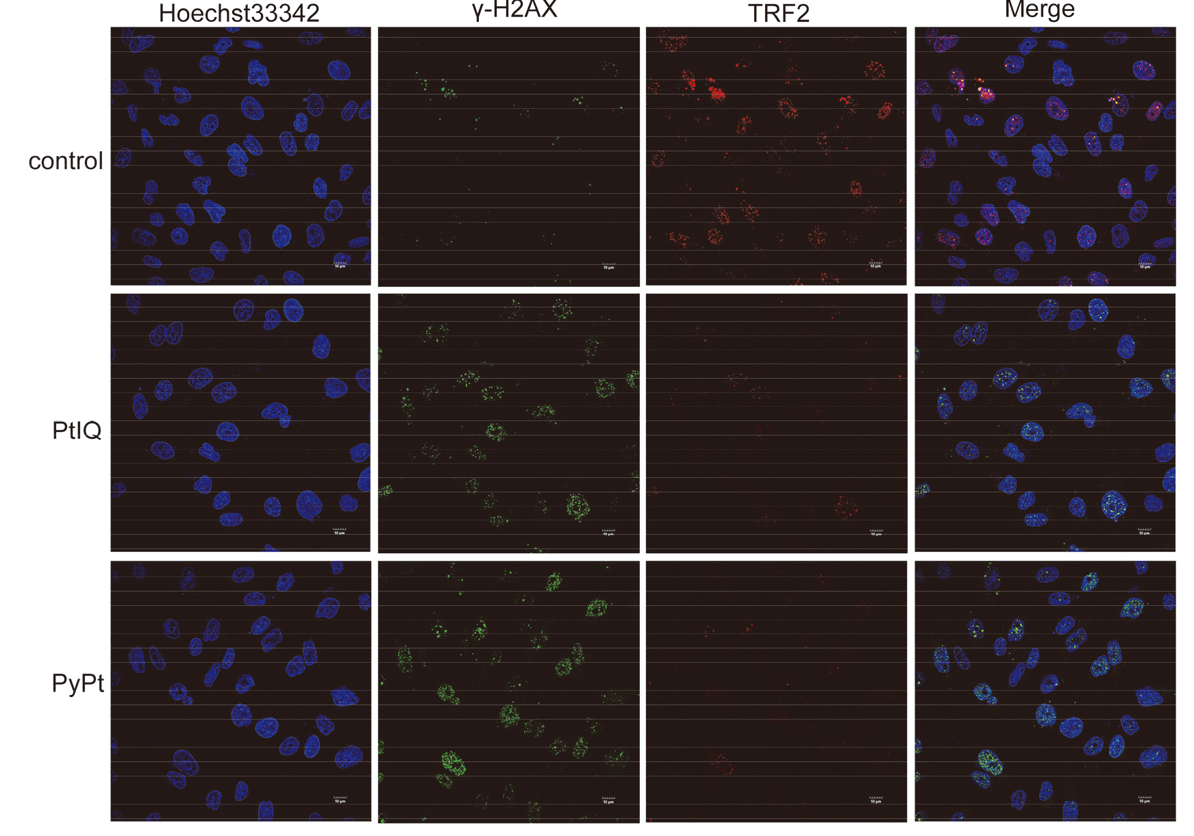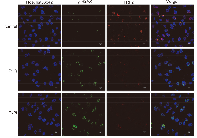 Figure 6 TRF2 foci and γ-H2AX quantification detected by immunofluorescence on MDA-MB-231 cells treated with PyPt (0.05 μmol/L) and PtIQ (9.0 μmol/L) for 48 h (n=3)