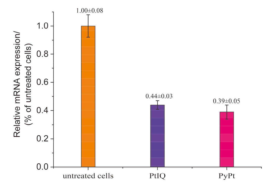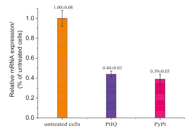 图8 RT-qPCR实验测定PyPt (0.05 μmol/L)和PtIQ (9.0 μmol/L)作用MDA-MB-231癌细胞48 h后hTERT RNA的表达情况