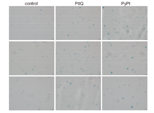 Figure 4 Cellular senescence of MDA-MB-231 cells induced by PyPt (0.05 μmol/L) and PtIQ (9.0 μmol/L)
