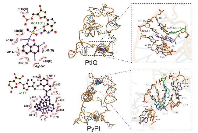 图7 分子对接研究PyPt和PtIQ与目标蛋白hTERT中DNA
