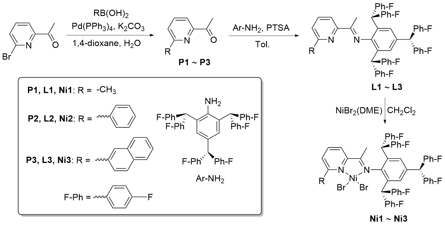 镍催化剂Ni1~Ni3由相应的配体与NiBr2(DME)在CH2Cl2中络合反应合成. Ni1~Ni3的典型合成方法如下: 在手套箱中, 称取NiBr2(DME) (0.31 g, 1.00 mmol)、配体(1.00 mmol)和无水CH2Cl2 (20 mL)于史莱克瓶中, 在氮气气氛下室温反应16 h. 反应结束后, 过滤悬浮液并真空浓缩除去溶剂, 加入正己烷重结晶, 抽滤后使用正己烷洗涤固体三次, 真空干燥得到固体粉末.