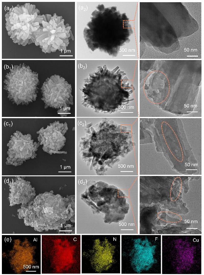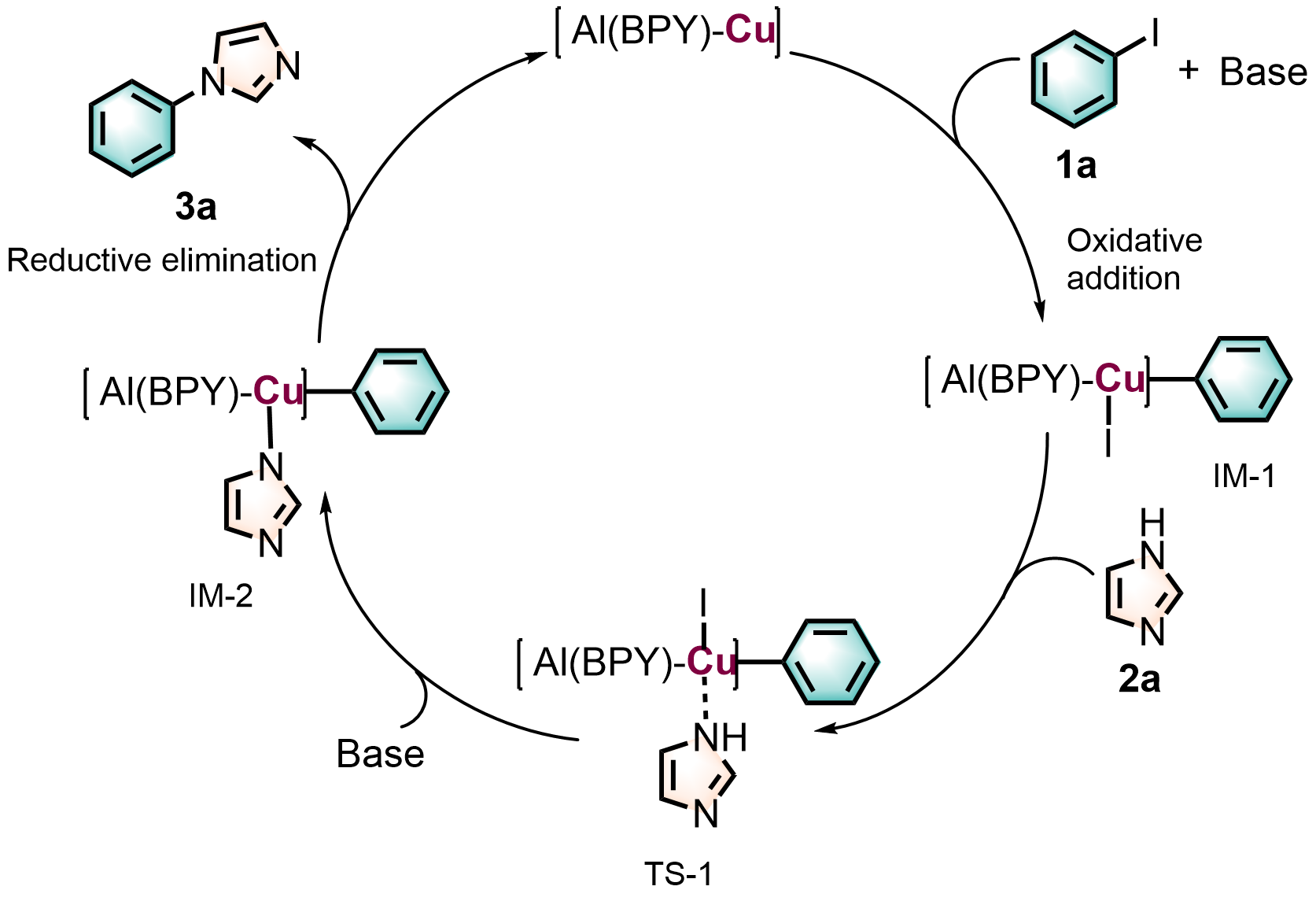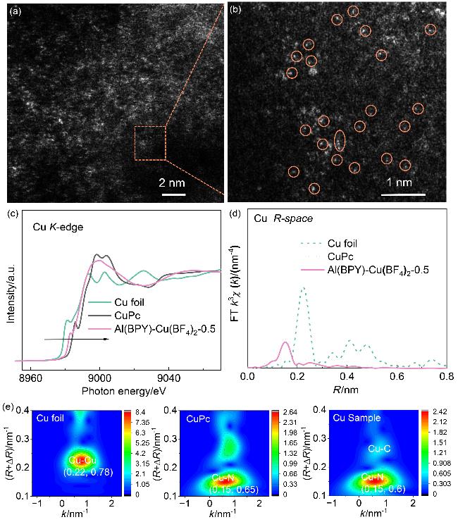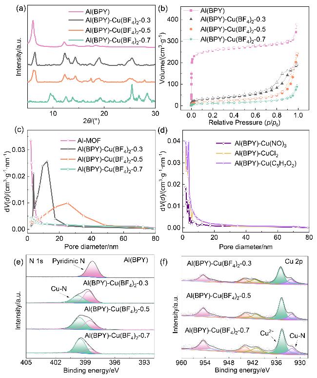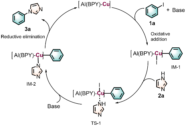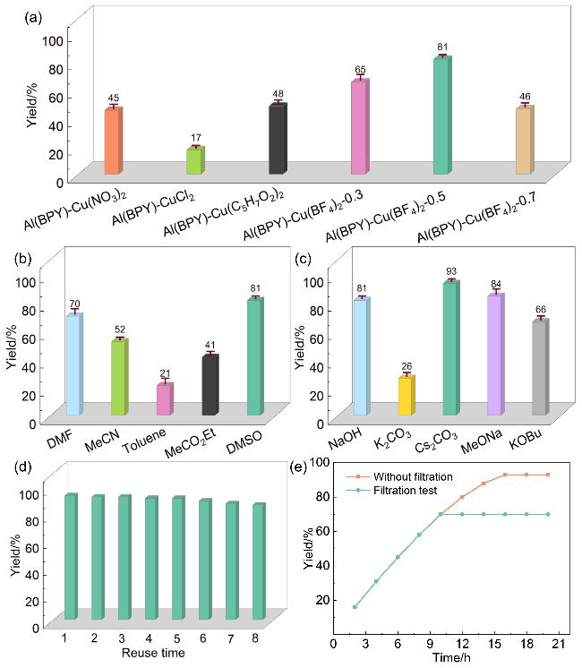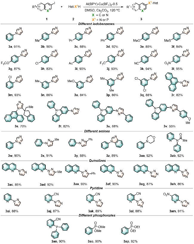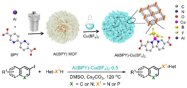 Nitrogen heterocycles serve as key structural components in modern pharmaceutical, materials, and agrochemical applications. Addressing the intrinsic limitations of conventional C—N coupling catalysts—particularly their poor catalytic efficiency and narrow substrate range—this investigation engineered an advanced catalytic architecture based on an Al(BPY) metal-organic framework (MOF). The synthetic route involved: (1) hydrothermal assembly of microporous Al(BPY) MOF employing 2,2'-bipyridine (BPY, rigid bidentate N-ligand) and AlCl3, followed by (2) controlled liquid-phase loading of Cu(BF4)2 as a bifunctional reagent (dual etchant and metal source). This innovative approach successfully accomplished two critical objectives concurrently: (i) in situ formation of hierarchically porous networks (pore size distribution: 1~50 nm) and (ii) atomic-level precision immobilization of mono-disperse copper active centers. Structural analysis showed $\text{BF}_{4}^{-}$ etches Al—O—C bonds forming mesopores, while Cu²⁺ coordinates with pyridinic N ensuring atomic dispersion. Rigorous evaluation of Al(BPY)-Cu(BF4)2's catalytic behavior in Ullmann C—N coupling reactions established distinct structure-activity correlations, with the Cu(BF4)2-modified catalyst exhibiting substantially superior activity relative to Cu(NO3)2-, CuCl2-, and Cu(acac)2-modified analogs. The Al(BPY)-Cu(BF4)2-0.5 demonstrated optimal catalytic performance, achieving 93% product yield under optimized reaction parameters (Cs2CO3 base, dimethylsulfoxide solvent, 120 ℃, 16 h). Notably, the catalyst displayed exceptional functional group compatibility (55%~95% yields across 42 diverse substrates including fused-ring systems, non-aromatic N-heterocycles, and P—H compounds) while maintaining remarkable tolerance toward both electronic and steric perturbations. The system successfully transcended conventional catalytic constraints by accomplishing: (i) efficient coupling of sterically demanding non-aromatic amines and (ii) pioneering MOF-mediated C—P bond formation—the first documented instance of such transformation in MOF-based catalytic systems. Furthermore, the material exhibited outstanding cycling stability, retaining >94% initial activity through 8 successive reaction cycles with negligible copper leach-ing (<0.2 mg/L). The exceptional catalytic efficiency originates from synergistic interplay between hierarchically porous channels (facilitating enhanced mass transport and active site accessibility) and atomic Cu centers (activating aryl iodides and X—H bonds).
