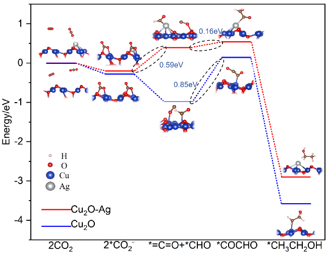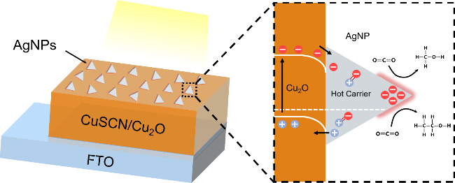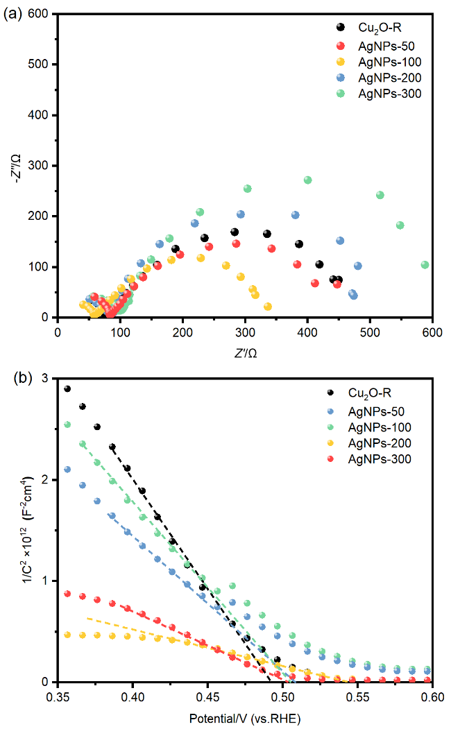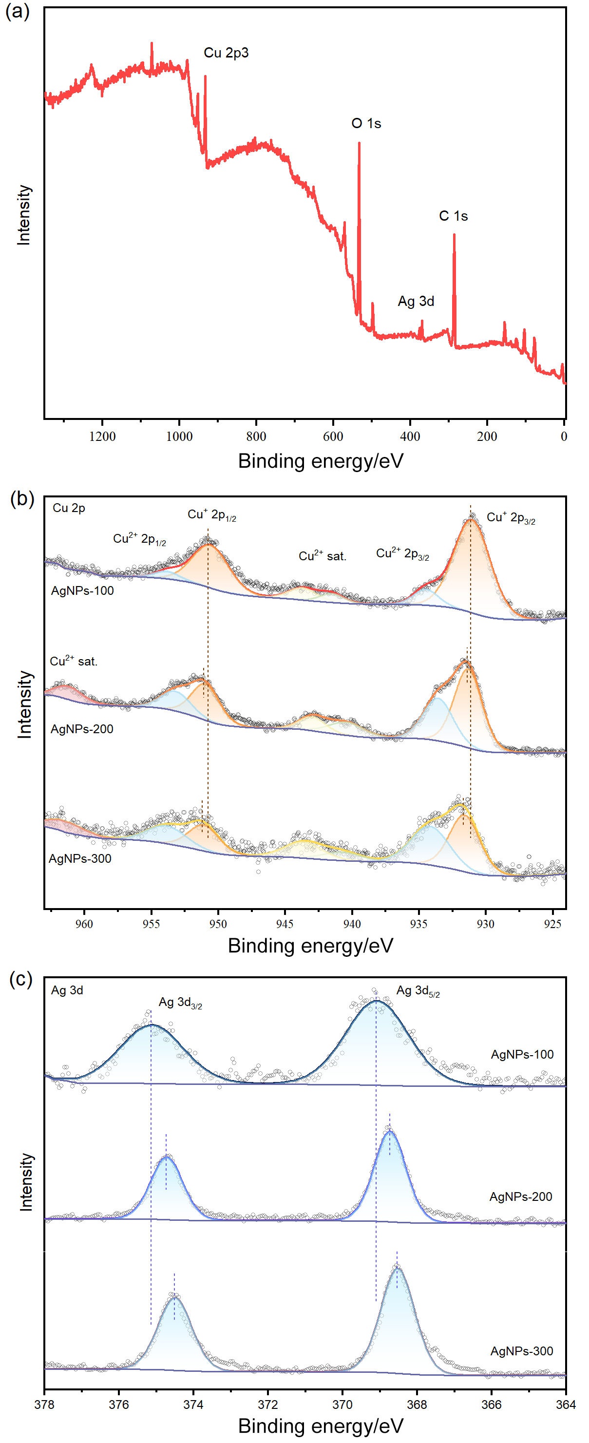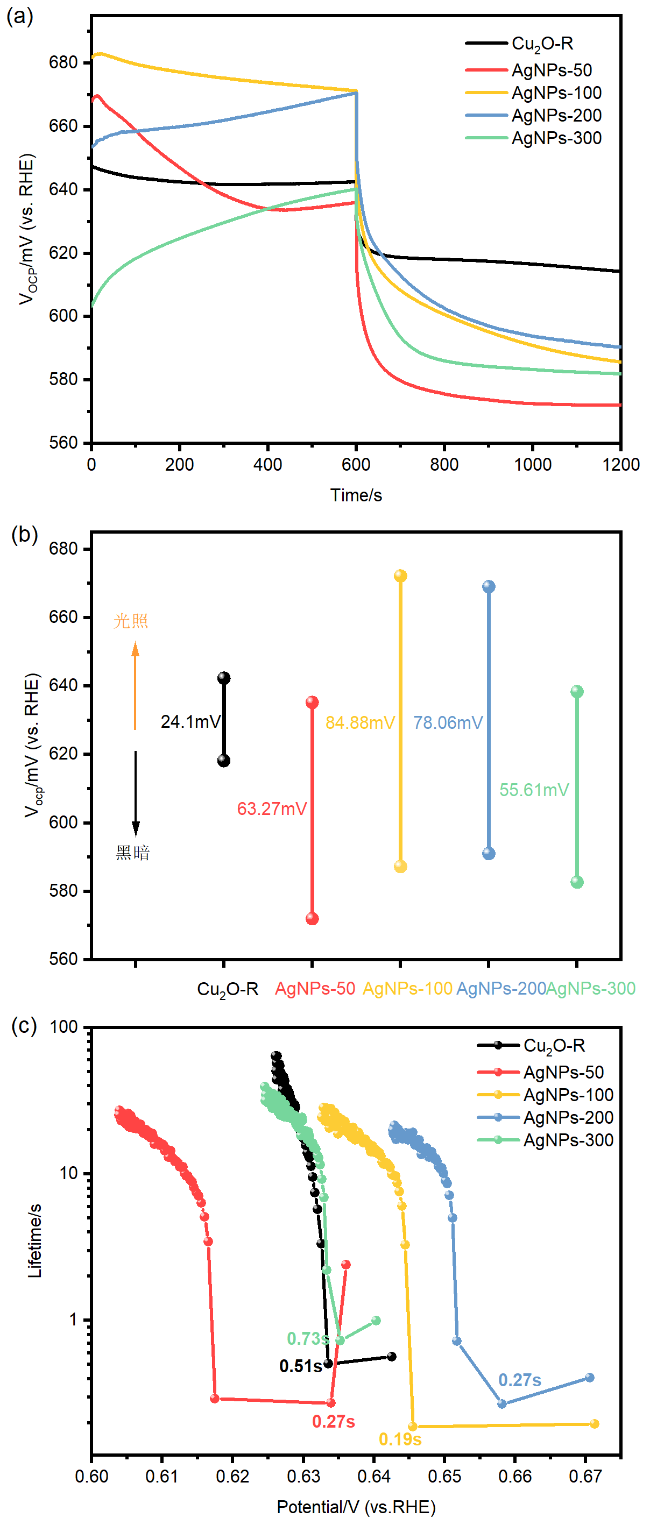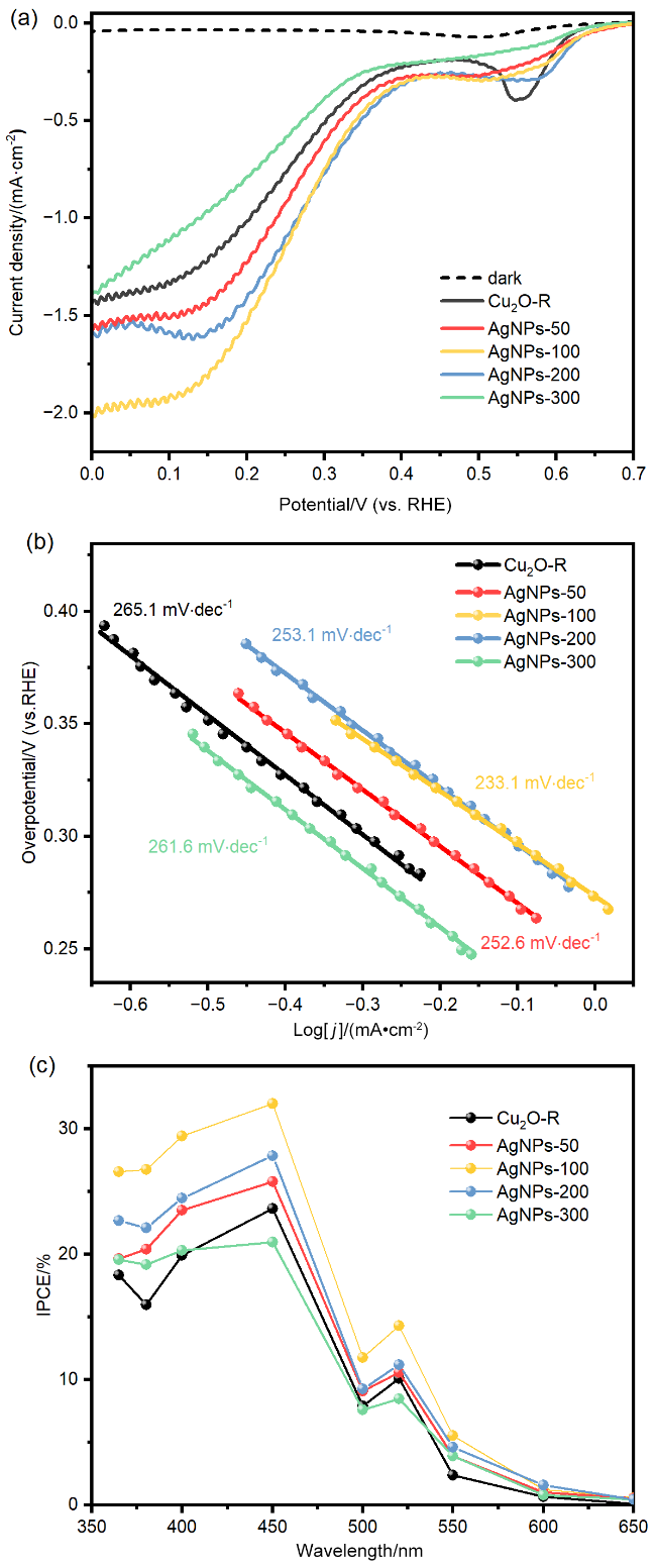 图3 (a) FTO/CuSCN/Cu2O/AgNPs光电阴极的XPS全谱图; 不同AgNPs负载量的FTO/CuSCN/Cu2O/AgNPs光电阴极XPS谱图对比: (b) Cu 2p轨道精细谱图; (c) Ag 3d轨道精细谱图Figure 3 (a) XPS survey spectrum of FTO/CuSCN/Cu2O/AgNPs photocathode; Comparison of XPS spectra of FTO/CuSCN/Cu2O/AgNPs photocathodes with different AgNPs loadings: (b) fine spectrum of Cu 2p orbital; (c) fine spectrum of Ag 3d orbital |