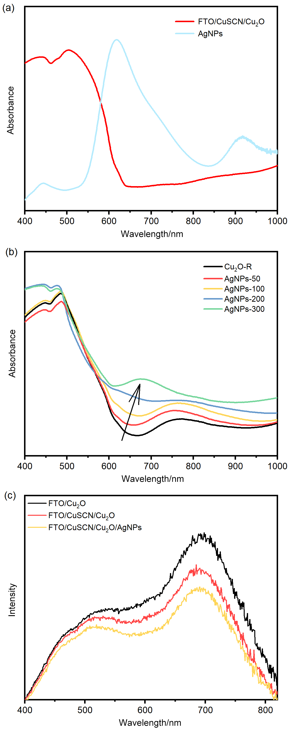 图4 (a) AgNPs溶液的光吸收特性; (b)不同AgNPs负载的复合光电阴极光吸收特性; (c) CuSCN改进与AgNPs负载修饰前后光电阴极的光致发光光谱Figure 4 (a) Optical absorption characteristics of AgNPs solution; (b) optical absorption characteristics of composite photocathodes with different AgNPs loadings; (c) PL of the photocathode before and after modification with CuSCN improvement and AgNPs loading. |