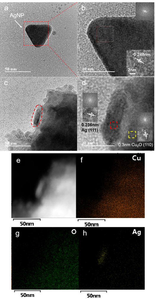 图1 (a)银纳米颗粒的TEM全貌图像; (b) AgNPs的TEM局部放大图像, 右上角插图是所选区域快速傅里叶变换图, 右下角显示AgNPs晶格间距; (c) Cu2O负载AgNPs (红色虚线区域)的TEM图像; (d) Cu2O/ AgNPs复合结构的局部放大TEM图像, 左、右插图分别对应Ag、Cu2O结构所选区域快速傅里叶变换图与晶格间距; (e~h)氧化亚铜负载银纳米颗粒EDS元素分布Figure 1 (a) TEM image of AgNPs; (b) magnified TEM image of AgNPs, with the inset in the upper right corner showing the fast Fourier transform (FFT) pattern of the selected area, and the lower right corner displaying the lattice spacing of the AgNPs; (c) TEM image of Cu2O loaded with AgNPs (red dashed area); (d) magnified TEM image of the Cu2O/AgNPs composite structure, with the left and right insets showing the FFT pattern and lattice spacing of the selected Ag and Cu2O regions, respectively; (e~h) EDS elemental distribution of silver nanoparticles supported on cuprous oxide |