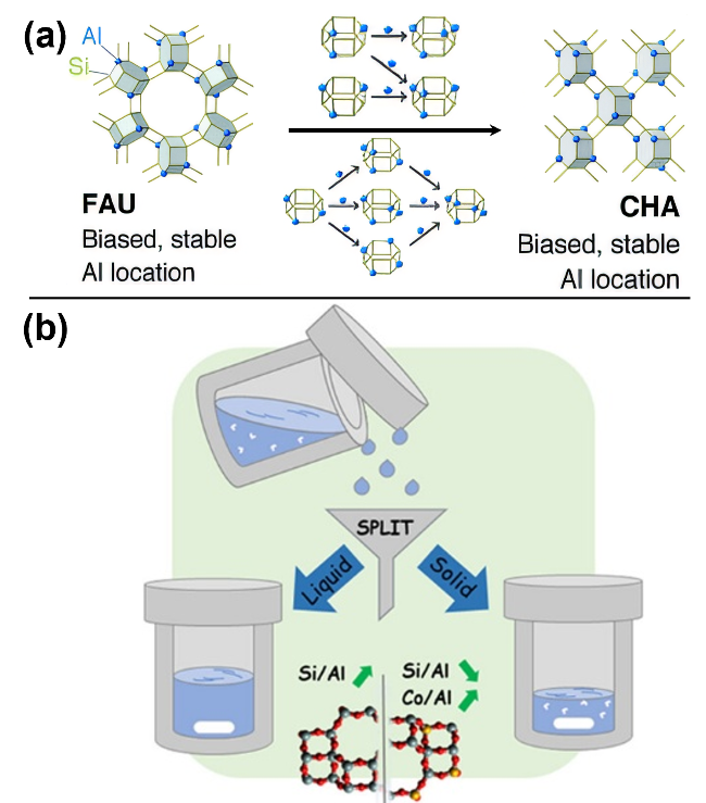 图6 FAU沸石转晶合成CHA沸石, FAU前驱体中的Al分布影响产物CHA沸石中Al分布的作用机制示意图(a)[96]及在FAU转晶合成CHA沸石所采用的分裂合成法示意图(b)[101]Figure 6 Schematic diagram illustrating (a) the mechanism of Al distribution in CHA zeolite product governed by FAU precursor during the FAU-to-CHA interzeolite conversion (IZC),[96] and (b) the split synthesis strategy used in the FAU-to-CHA IZC process[101] |