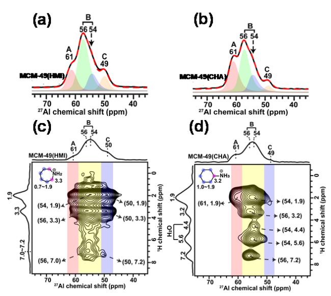 图10 以HMI和CHA为模板剂合成的MCM-49(HMI)和MCM-49(CHA)的27Al MAS NMR (a, b)及1H-27Al D-RINEPT NMR谱图(c, d)[135]Figure 10 27Al MAS NMR spectra (a, b) and 1H-27Al D-RINEPT spectra (c, d) of MCM-49 (HMI) and MCM-49 (CHA) synthesized using HMI and CHA as structure-directing agents. (Adapted with permission from reference [135], Copyright 2021, American Chemical Society) |