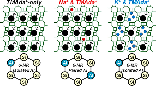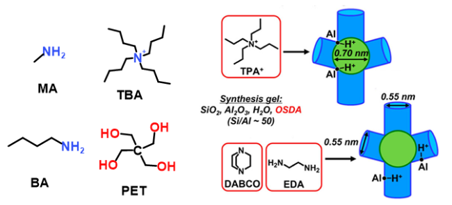 图3 合成ZSM-5沸石控制Al分布的常见结构导向剂及刚性季铵盐与柔性可成氢键有机胺导向不同Al分布示意图[63]Figure 3 Schematic draws of common SDAs used to synthesize ZSM-5 zeolite for controlling Al distribution, and the different Al distributions directed by rigid quaternary ammonium salts versus flexible, hydrogen-bond-capable organic amine. (Adapted with permission from reference [63], Copyright 2024, American Chemical Society) |