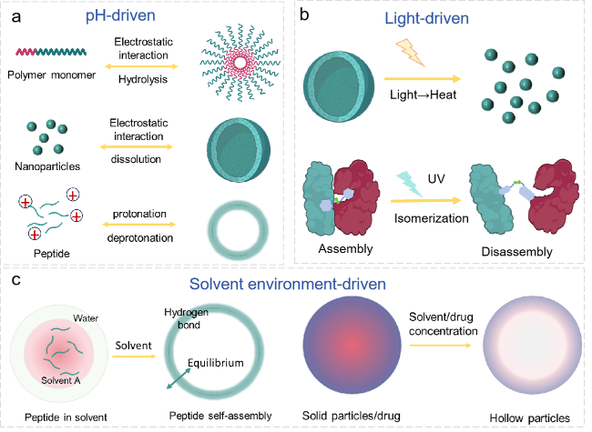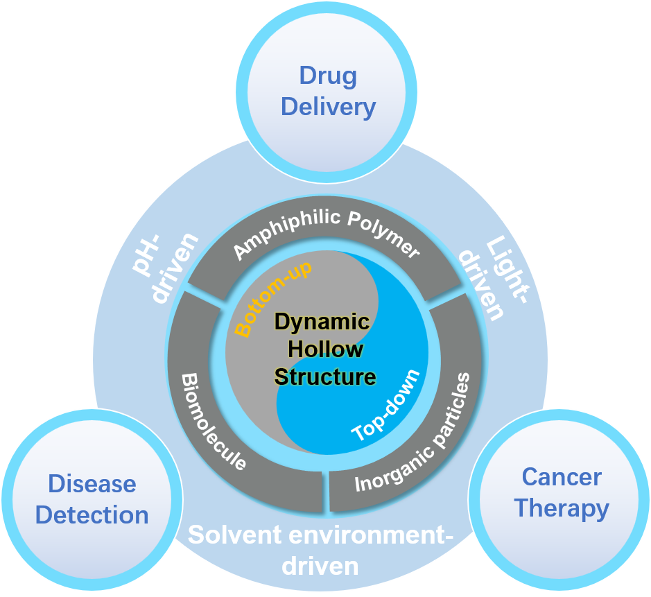 The dynamic evolution of living organisms has inspired extensive research on multi-level dynamic assembly materials, a cutting-edge direction in materials chemistry that bridges fundamental science and practical applications. Driven by dynamic chemistry, these materials rely on covalent and non-covalent interactions to gain intelligent properties like stimulus responsiveness, structural reversibility and self-healing, strongly supporting their great potential in biomedicine, especially in precise diagnosis and targeted therapy. Hollow structures, featuring unique spatial configurations, high volume ratio cavities and modifiable surfaces properties, are inspired by natural systems like cells and blood vessels. It naturally fulfills indispensable functions of protection, loading and transportation. Through elaborate internal space design, researchers have further constructed multi-core, multi-shell, and multi-compartment structures, significantly expanding the hollow structure's functional boundaries and application scenarios, and endowing it with irreplaceable advantages in drug delivery, energy conversion and storage. Combining these advantages, dynamic intelligent hollow materials have emerged as a prominent research hotspot in biomedicine, while facing critical challenges. Their design demands establishing clear structure-activity relationships to achieve controllable fabrication of multi-level structures and precise regulation of size and morphology. Additionally, these materials must integrate core functions including targeting, theranostics and self-healing, while balancing in vivo stability, biocompatibility and metabolic safety, and effectively resolving the controllability and long-term efficacy of dynamic evolution under complex and dynamic physiological environments. This review presents systematic strategies for constructing multifunctional systems with dynamic hollow structures, focusing on the systematic summary of dynamic building blocks (e.g., polymers, inorganic nanoparticles, biological macromolecules) and driving forces (including pH, light and solvent environment), classified into top-down and bottom-up approaches. Furthermore, applications of dynamic hollow structures in drug delivery, disease detection, and cancer treatment are discussed in detail. Finally, the review provides a forward-looking perspective on the rational design and synthesis of hollow multishelled structure, as well as their application prospects in hierarchical targeted therapy, pulsed drug release, and theragnostic integration, aiming to guide the development of next-generation advanced biomaterials.