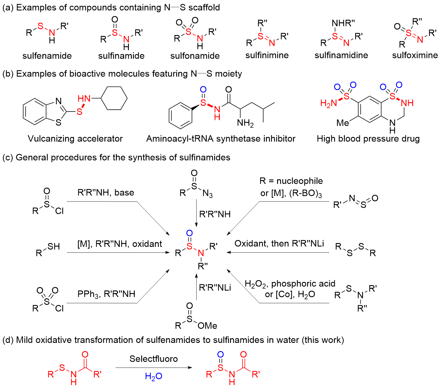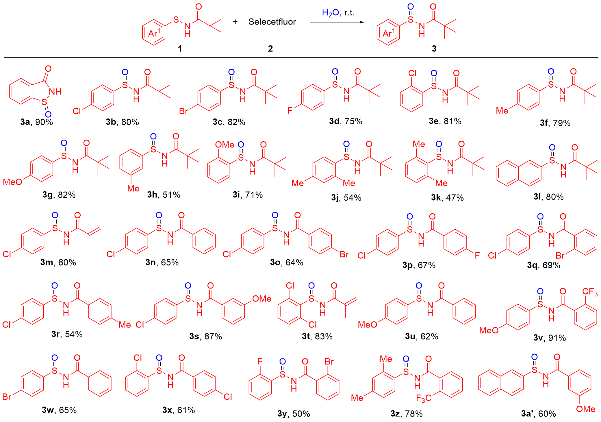 开发了一种绿色高效的亚磺酰胺合成方法, 该方法以Selectfluor为氧化剂, 能够在水相中实现次磺酰胺的氧化转化. 该温和反应体系具有良好的底物适用性, 能够兼容多种官能团. 在无其他添加剂的条件下, 反应能够顺利进行, 并且以中等至良好的收率获得相应的亚磺酰胺产物. 同时, 放大反应的成功进行也体现了该方法在放大实验和实际应用中的潜力.