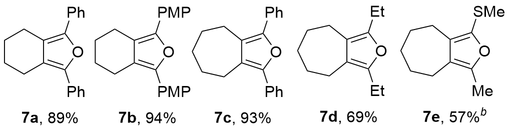 报道了一种基于分子内串联重排反应的双环呋喃类化合物的合成策略. 该串联反应由三氟化硼乙醚络合物催化的炔基硫醚与炔基亚砜的分子内交叉偶联引发, 随后经历[3,3]-σ硫鎓离子重排及5-exo-dig环化反应, 最终以中等产率以及100%原子经济性获得产物环烷并[c]呋喃. 所得呋喃类化合物的合成应用价值已通过对产物中烷硫基和呋喃环的后修饰反应得到验证.