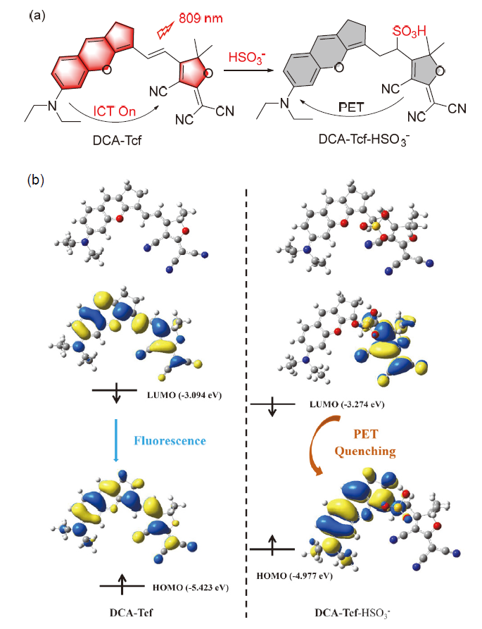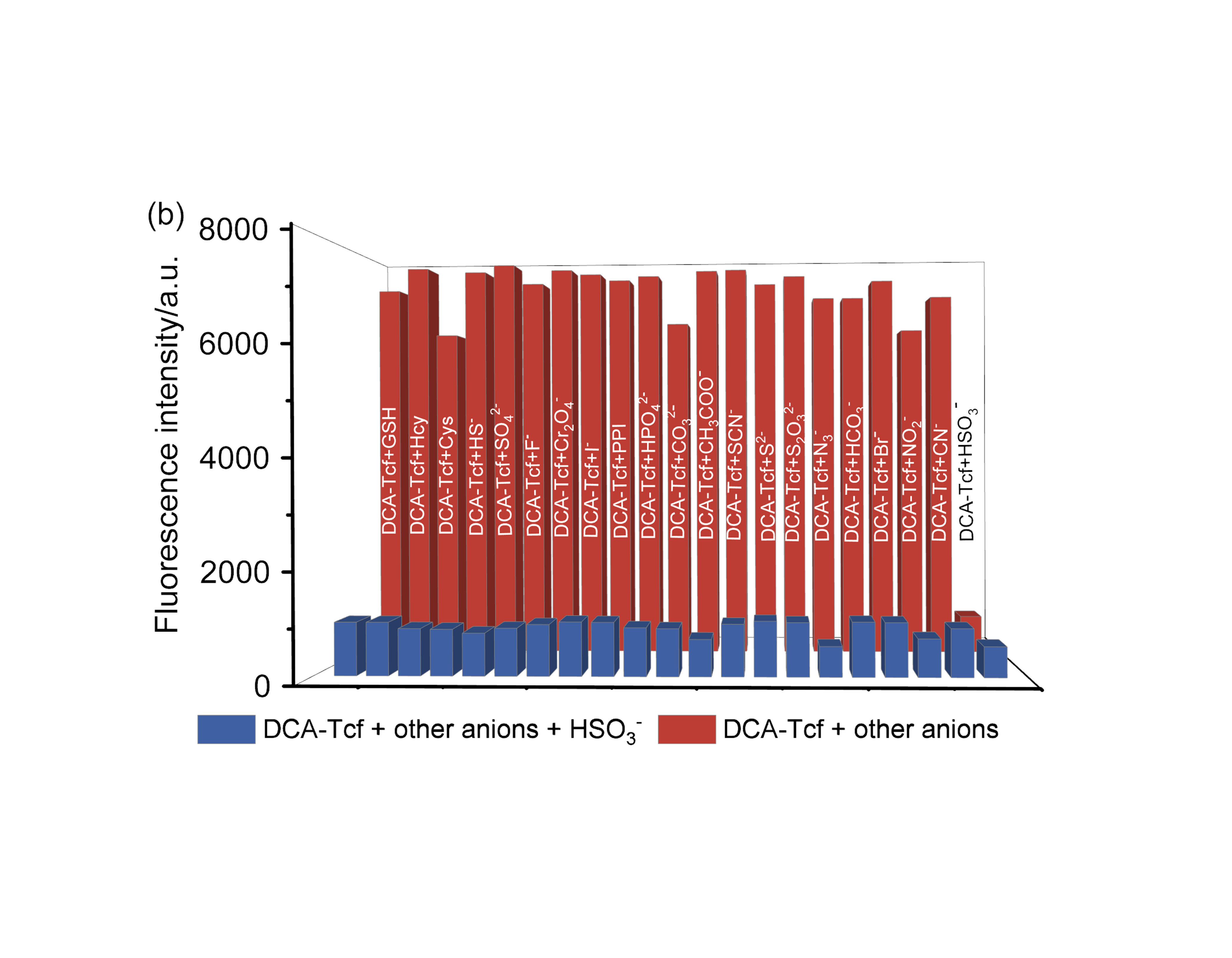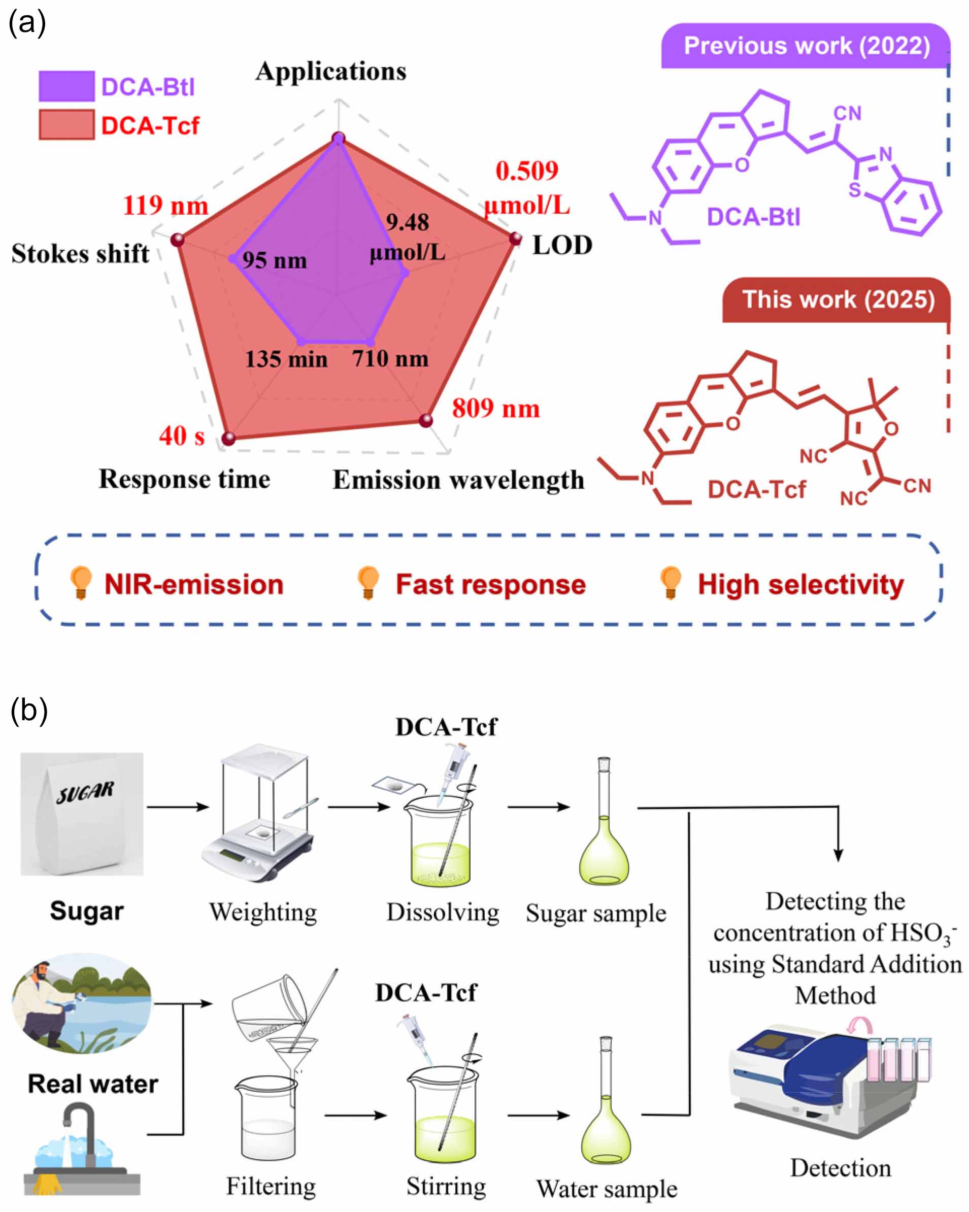 开发了一种近红外(NIR)荧光探针DCA-Tcf用于检测生物体系和食品样本中的二氧化硫衍生物($\mathrm{HSO}_{3}^{-} / \mathrm{SO}_{3}^{2-}$). 该探针以6-(二乙基氨基)-1,2-二氢环戊烯[b]苯并吡喃为荧光团, 通过引入吸电子基, 使其发射波长延伸至809 nm, 突破了小分子探针通常难以逾越的800 nm波长限制. 该发射波长可有效增强组织穿透深度并降低背景荧光干扰, 使该探针在生物成像应用中更具优势. 探针DCA-Tcf识别$\mathrm{HSO}_{3}^{-} / \mathrm{SO}_{3}^{2-}$表现出高选择性、快速响应(40 s)以及低至0.509 μmol/L的检测限, 并在真实水样和糖样中成功检测$\mathrm{HSO}_{3}^{-}$, 在活细胞荧光成像中展示出应用潜力. 本研究开发的DCA-Tcf在食品安全检测和生物成像领域可成为一种有力工具.