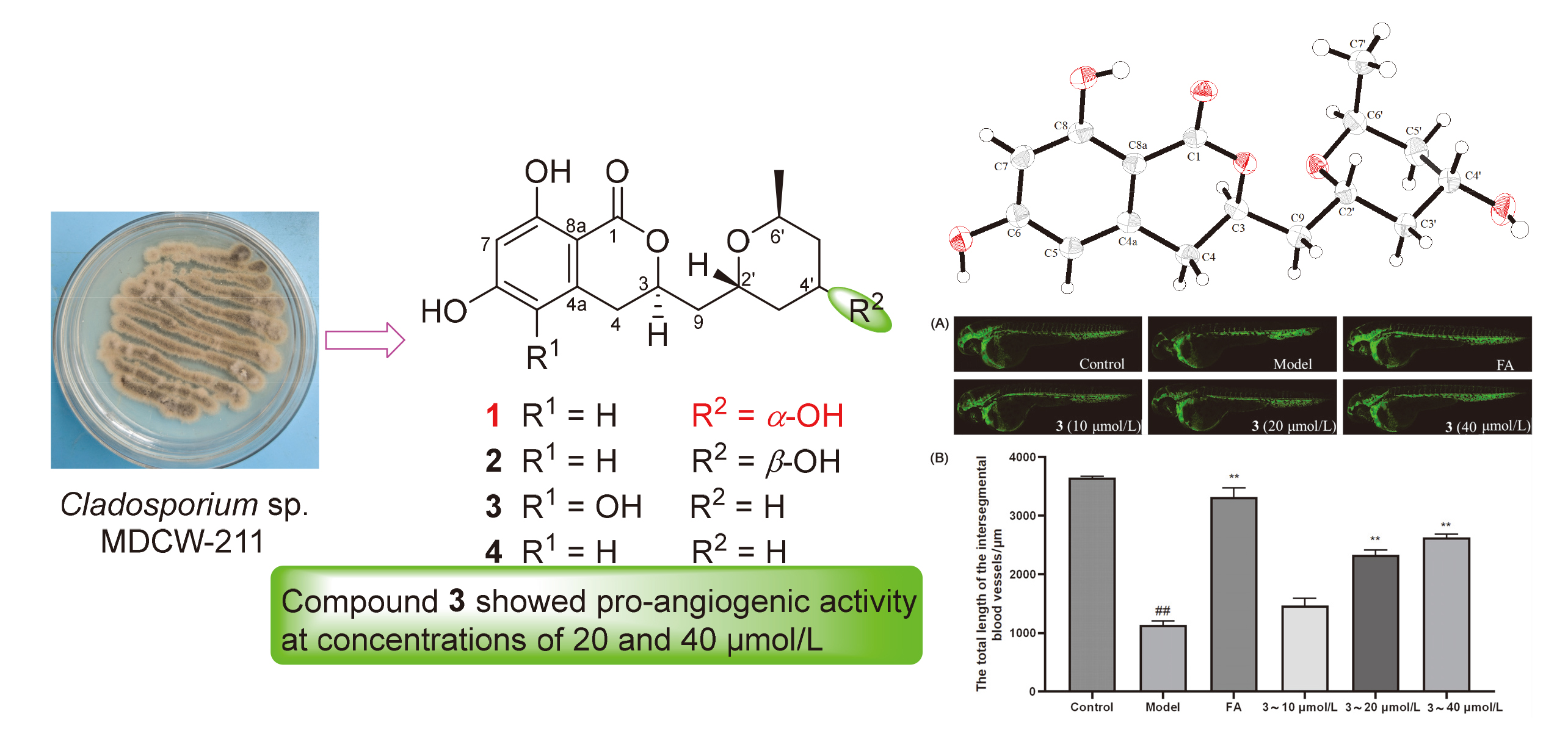 封面介绍The isolation of one new dihydroisocoumarin (1) and three known compounds (2~4) from the marine fungus Cladosporium sp. MDW-211 was reported by Wang, Zheng, Zhang, Gao, Kong, Li, Wang, and Cao on page 684. The absolute configuration of compound 1 was determined by X-ray diffraction analysis. Evaluation using a zebrafish model demonstrated that compound 3 exhibited significant pro-angiogenic activity at concen-trations of 20 and 40 μmol/L. -