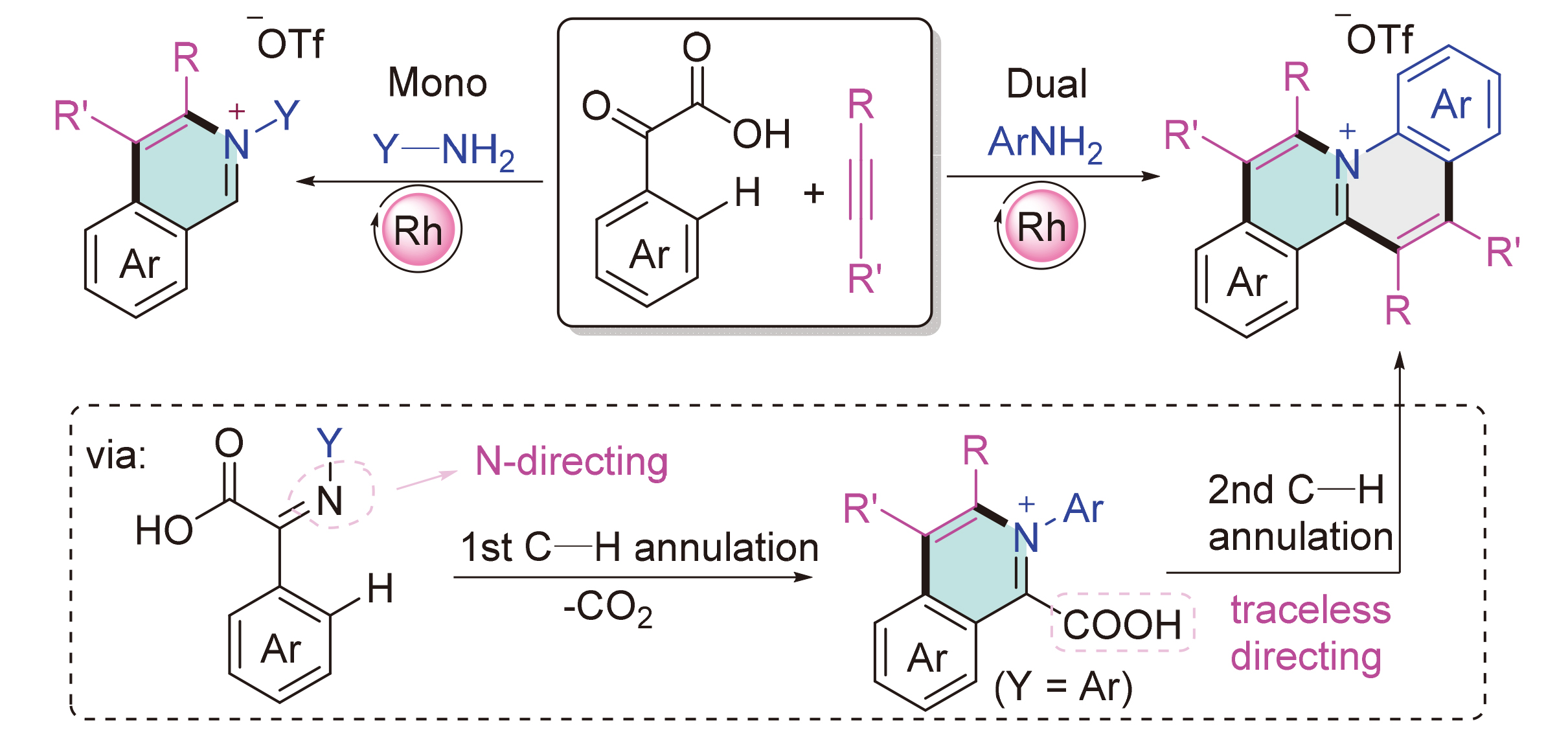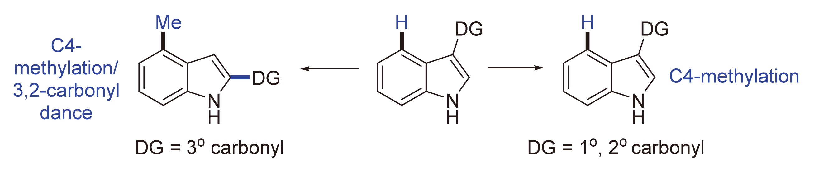封面介绍Despite the advances in other site-selective methylations, there are scarce reports on C4 methylation of indoles and combination of a carbonyl rearrangement with C—H methylation on indole ring. Herein, the C4 methylation of indoles and the steric controlled C4-methy- lation/carbonyl migration are reported by Xie, Cheng, and An on page 475. The large steric hindrance at carbonyl facilitates the carbonyl migration, which provides a straightforward protocol for the synthesis of C2/C4 disubstituted indoles. -