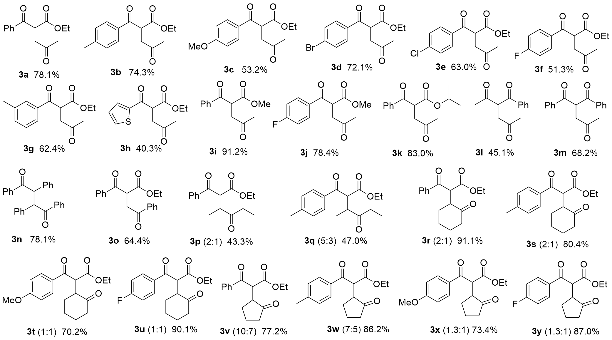 过渡金属催化的C—C偶联反应是有机合成中构建碳-碳键的核心策略, 其发展不仅推动了药物、材料和天然产物 的合成, 还不断在机理创新和催化剂设计上取得突破. 在此基础上, 报道了在铜催化条件下酮类之间发生的自由基反应, 利用该反应可以实现2-羰基-1,4-二酮化合物的合成. 该方法对多种结构类型的酮(包括取代基多样的脂肪酮、芳香酮和各种不限于丙酮的简单酮)均表现出优异的适用性, 用途广泛, 易于实施, 催化剂毒性低, 成本效益高, 且产物易于分离纯化.