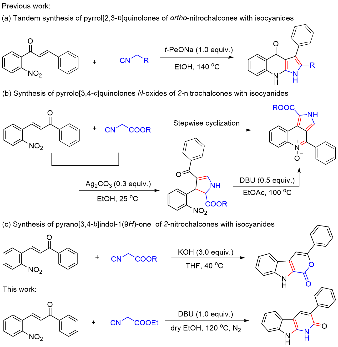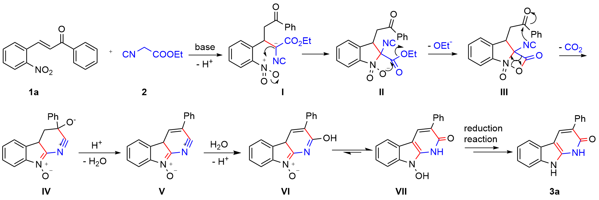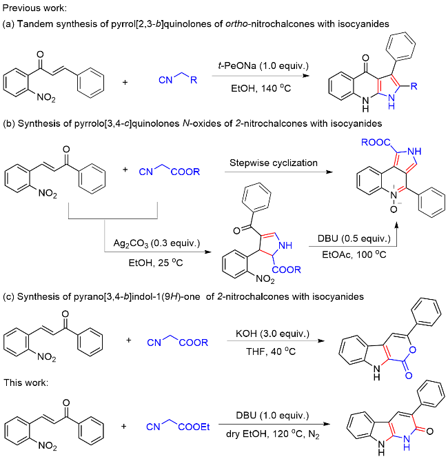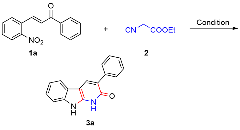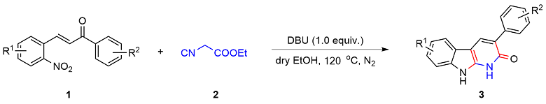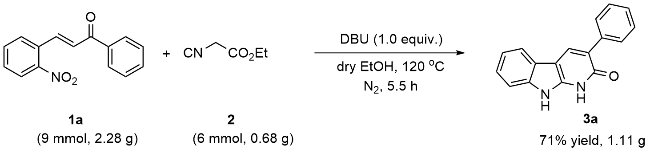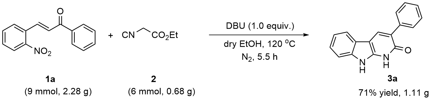 以底物3-苯基-1,9-二氢-2H-吡啶并[2,3-b]吲哚-2-酮(3a)的合成为例: 真空环境下, 在25 mL的圆底烧瓶中将(E)-3-(2-硝基苯基)-1-苯基丙-2-烯-1-酮(1a) (0.076 g, 0.3 mmol)与异氰基乙酸乙酯(2) (0.023 g, 0.2 mmol)溶解于10 mL超干乙醇溶剂中, 向体系加入DBU (0.070 g, 0.3 mmol), 120 ℃ N2保护条件下搅拌反应4 h. 待反应完成后(TLC监测), 将体系缓慢倒入水中, 加饱和的NH4Cl水溶液以淬灭反应. 然后将混合溶液用乙酸乙酯(20 mL×3)萃取, 合并有机相, Na2SO4干燥, 真空浓缩. 残余物经硅胶柱层析纯化(层析液: 石油醚/乙酸乙酯, V/ V=20/1), 得到3-苯基-1,9-二氢-2H-吡啶并[2,3-b]吲哚-2-酮(3a), 产率为81%. 以相同方法合成化合物3a~3n.