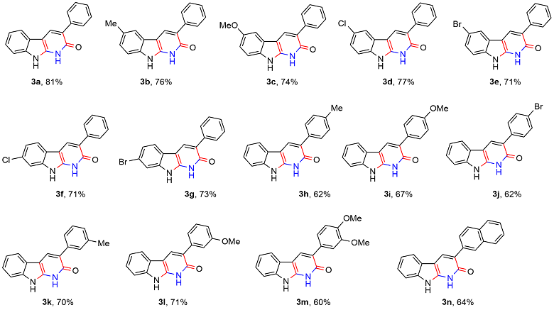 3-苯基-1,9-二氢-2H-吡啶并[2,3-b]吲哚-2-酮(3a): 收率81%, 淡黄色油状物. 1H NMR (600 MHz, DMSO-d6) δ: 12.02 (s, 1H), 11.61 (s, 1H), 8.12 (d, J=6.0 Hz, 1H), 7.81 (d, J=12.0 Hz, 2H), 7.54 (d, J=6.0 Hz, 1H), 7.49 (t, J=9.0 Hz, 2H), 7.44~7.39 (m, 3H), 7.21 (t, J=9.0 Hz, 1H); 13C NMR (151 MHz, DMSO-d6) δ: 156. 6, 139.9, 136. 8, 135.1, 129.2 (2C), 128.9, 127.6, 127.0, 127.0 (2C), 125.3, 122.7, 122.0, 120.2, 113.0, 99.2. HRMS (ESI) calcd for C17H13N2O [M+H]+ 261.1023, found 261.1030.
