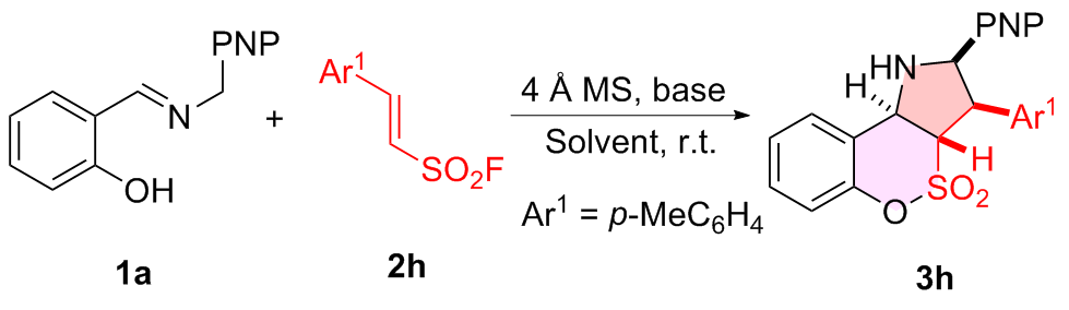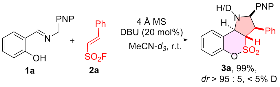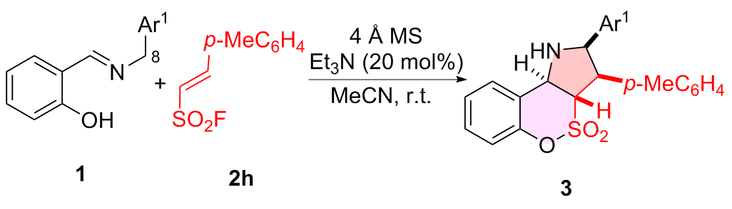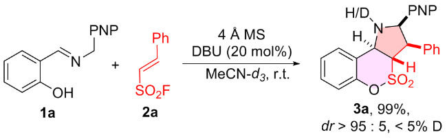 a Reaction conditions: 1 (0.20 mmol), 2h (0.20 mmol), Et3N (20 mol%), 4 Å MS (200 mg), MeCN (2.0 mL), r.t., 48 h, atmosphere. b Determined by 1H NMR using CH2Br2 as the internal standard. c Diastereomeric ratio determined by 1H NMR spectroscopy. d N.D.=Not detected. |