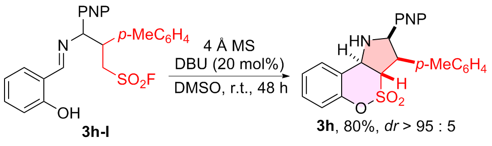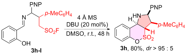 a Reaction conditions: 1a (0.20 mmol), 2h (0.20 mmol), base (20 mol%), 4 Å MS (200 mg), solvent (2.0 mL), r.t., 48 h, atmosphere, PNP=p-nitrophenyl. b Determined by 1H NMR using CH2Br2 as the internal standard. c Diastereomeric ratio determined by 1H NMR spectroscopy. d Isolated yield. e DBU (10 mol%) was used. f Without DBU. g Without 4 Å MS. h 4 Å MS (100 mg) was used. i Without DBU and 4 Å MS. j N.D.=Not detected. |