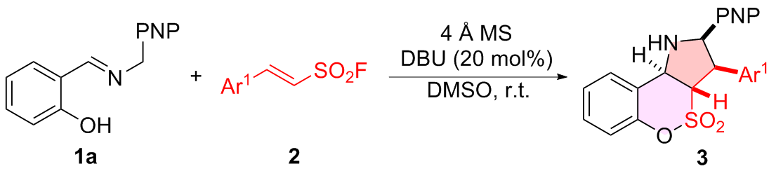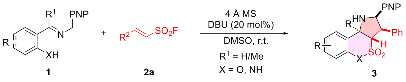 a Reaction conditions: 1 (0.20 mmol), 2a (0.20 mmol), DBU (20 mol%), 4 Å MS (200 mg), DMSO (2.0 mL), r.t., 48 h, atmosphere; diastereomeric ratio determined by 1H NMR spectroscopy, all of the case dr>95∶5. Isolated yield. |