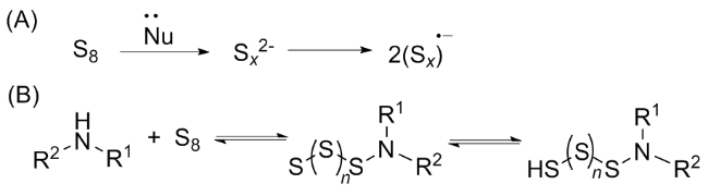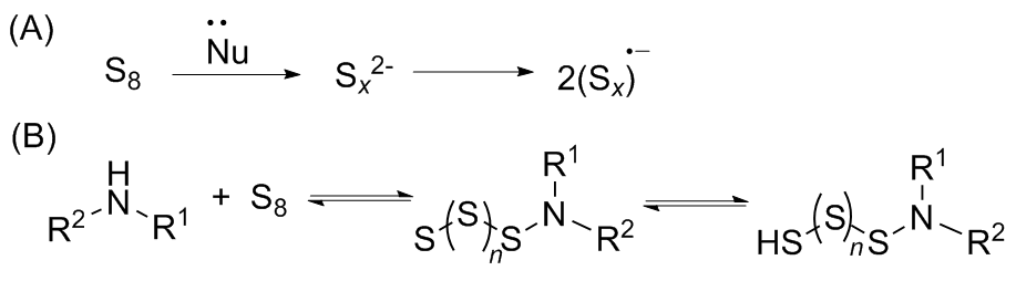 e) acting as an electrophile, is supported by the easy activation of sulphur by nucleophilic additives, such as aliphatic amines and hydroxyl, sulphide, and cyanide anions, and the correspondingly milder conditions compared to thermal activation (