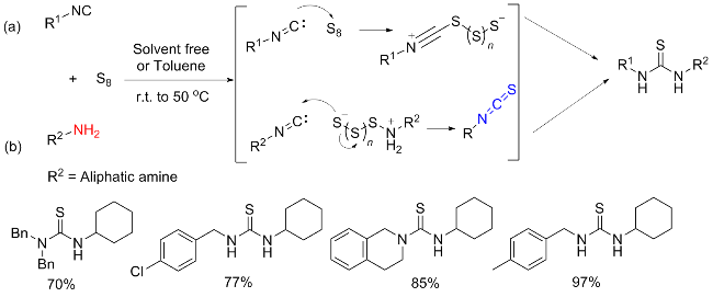 [37] This has led researchers to discover that catalysis or other types of activation, particularly nucleophilic additives, are necessary for an efficient, valuable, and comprehensive methodology. The most effective substitute for integrating the sulphur atom into the product is elemental sulphur. Sulphur, which acts as an electrophile because of its vacant d-orbitals, is attacked nucleophilically by