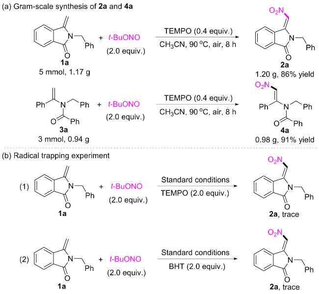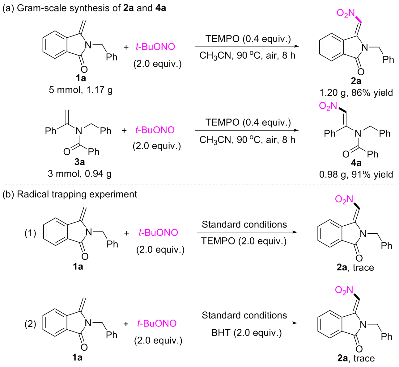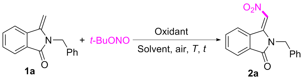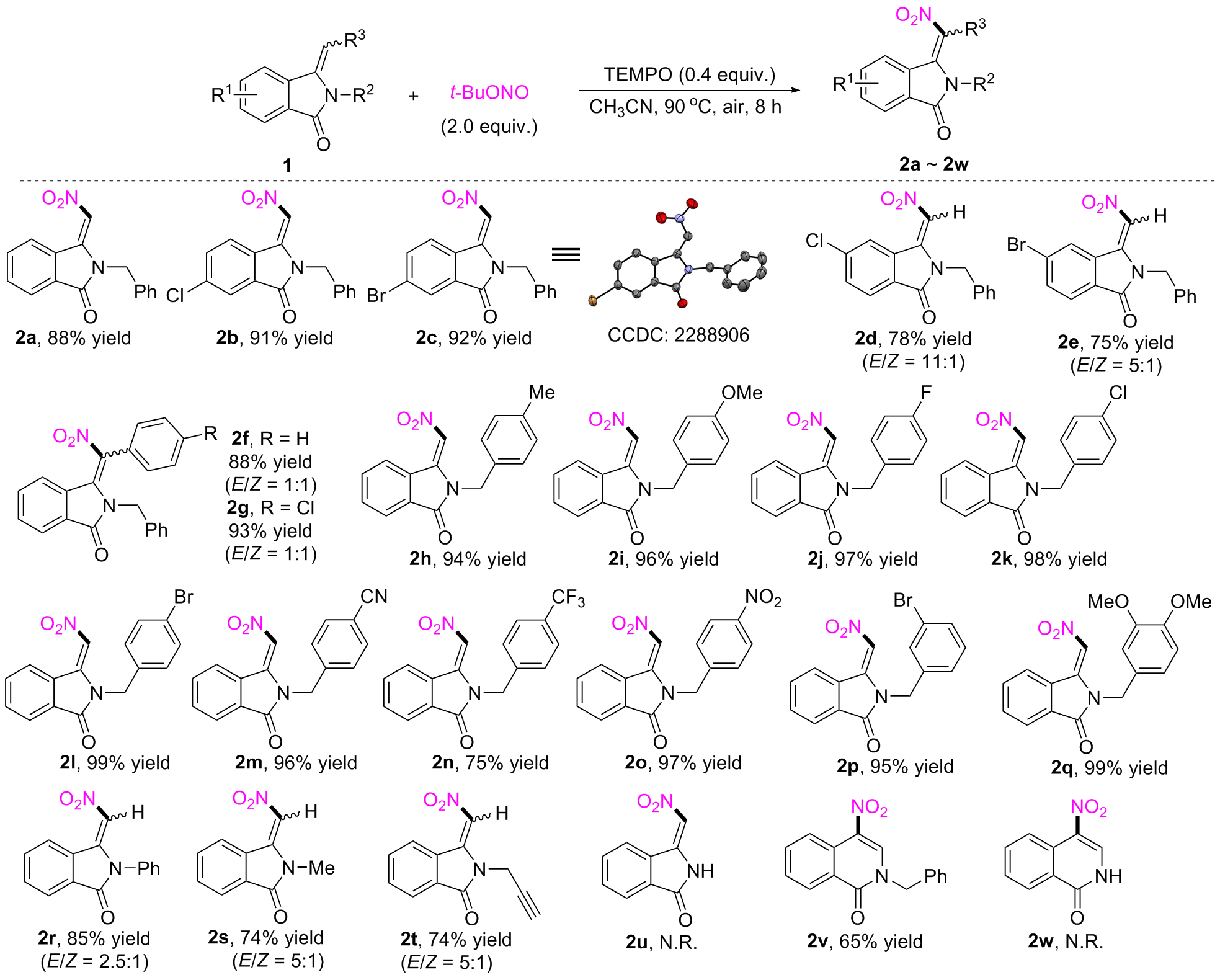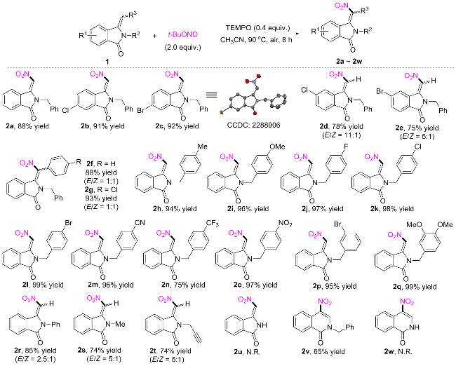(E)-2-Benzyl-3-(nitromethylene)isoindolin-1-one (2a): Light yellow solid (123.2 mg, 88% yield). m.p. 102~104 ℃; 1H NMR (500 MHz, Chloroform-d) δ: 8.74~8.67 (m, 1H), 7.98 (dt, J=6.7, 2.0 Hz, 1H), 7.77~7.67 (m, 2H), 7.38~7.33 (m, 2H), 7.33~7.28 (m, 1H), 7.23 (dd, J=7.0, 1.8 Hz, 2H), 7.13 (s, 1H), 5.00 (s, 2H); 13C NMR (126 MHz, Chloroform-d) δ: 166.8, 144.6, 134.4, 134.3, 133.0, 131.7, 129.7, 129.3, 128.8, 128.3, 126.9, 124.4, 121.3, 44.0. HRMS (ESI) calcd for C16H13N2O3 [M+H]+ 281.0921, found 281.0913.