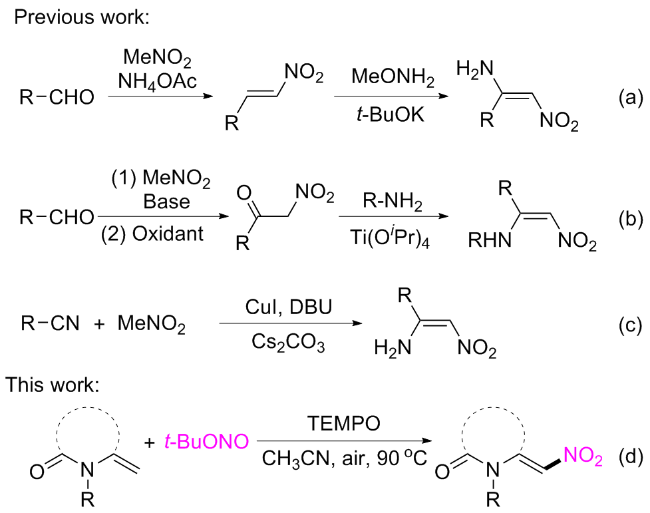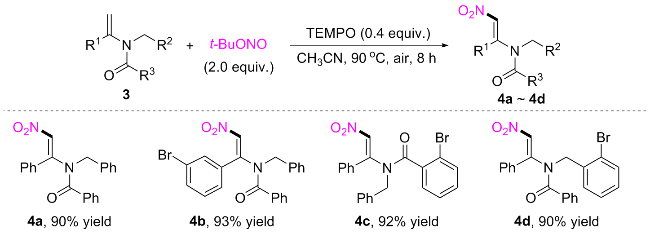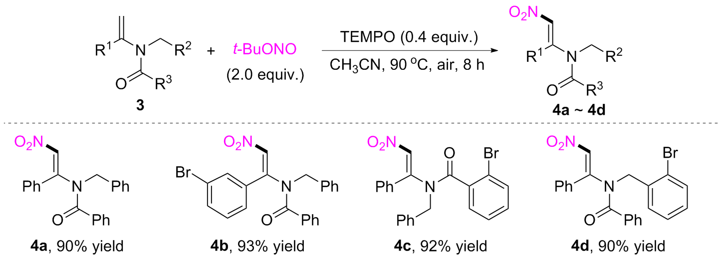 (E)-N-Benzyl-N-(2-nitro-1-phenylvinyl)benzamide (4a): Light yellow solid (161.2 mg, 90% yield). m.p. 179~181 ℃; 1H NMR (500 MHz, DMSO-d6) δ: 7.69~7.63 (m, 2H), 7.59 (t, J=7.4 Hz, 1H), 7.52~7.46 (m, 4H), 7.44~7.38 (m, 2H), 7.32 (t, J=7.6 Hz, 2H), 7.28~7.23 (m, 3H), 7.18 (dd, J=7.1, 2.5 Hz, 2H), 4.93 (d, J=137.2 Hz, 2H); 13C NMR (126 MHz, DMSO-d6) δ: 170.5, 148.5, 135.8, 134.4, 132.3, 131.9, 131.4, 131.1, 129.4, 129.2, 128.9, 128.2, 128.0, 127.7, 127.6, 51.5. HRMS (ESI) calcd forC22H19N2O3 [M+H]+ 359.1390, found 359.1382.