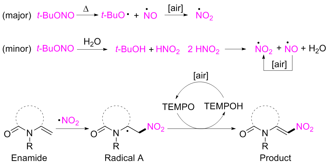 (E)-N-Benzyl-N-(1-(3-bromophenyl)-2-nitrovinyl)ben-zamide (4b): Light yellow solid (102.7 mg, 93% yield). m.p. 120~122 ℃; 1H NMR (500 MHz, Chloroform-d) δ: 7.58 (dt, J=7.8, 1.5 Hz, 1H), 7.48~7.43 (m, 2H), 7.38~7.34 (m, 1H), 7.32 (t, J=1.9 Hz, 1H), 7.30~7.19 (m, 8H), 7.16 (dt, J=7.8, 1.4 Hz, 1H), 6.85 (s, 1H), 4.97 (s, 2H); 13C NMR (126 MHz, Chloroform-d) δ: 171.3, 147.8, 135.6, 135.5, 135.0, 134.8, 131.6, 131.4, 130.9, 129.7, 128.7, 128.5, 128.3, 127.9, 127.2, 123.5, 52.1. HRMS (ESI) calcd for C22H18BrN2O3 [M+H]+ 437.0495, 439.0475, found 437.0504, 439.0484.