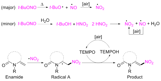 3-(Nitromethylene)-2-(prop-2-yn-1-yl)isoindolin-1-one (2t): A mixture of the (E) and (Z) isomers, E/Z=5∶1. Yellow solid (84.4 mg, 74% yield). m.p. 138~140 ℃; 1H NMR (500 MHz, Chloroform-d) δ: 8.75 (d, J=7.9 Hz, 1H), 7.98~7.92 (m, 1H), 7.77 (td, J=7.7, 1.4 Hz, 1H), 7.74~7.66 (m, 1+3×0.2H), 7.46 (s, 1H), 7.36 (s, 0.18H), 5.03 (d, J=2.5 Hz, 0.39H), 4.60 (d, J=2.5 Hz, 2H), 2.39 (t, J=2.5 Hz, 1H), 2.26 (t, J=2.5 Hz, 0.16H); 13C NMR (126 MHz, Chloroform-d) δ: 165.5, 143.8, (138.0), (136.5), 134.5, (134.0), 133.1, (132.6), 131.7, 129.6, 129.0, (127.1), (125.2), 124.6, 121.5, (120.7), (116.3), 75.7, 74.4, (73.8), (32.9), 29.7. HRMS (ESI) calcd for C12H9N2O3 [M+H]+ 229.0608, found 229.0600.
