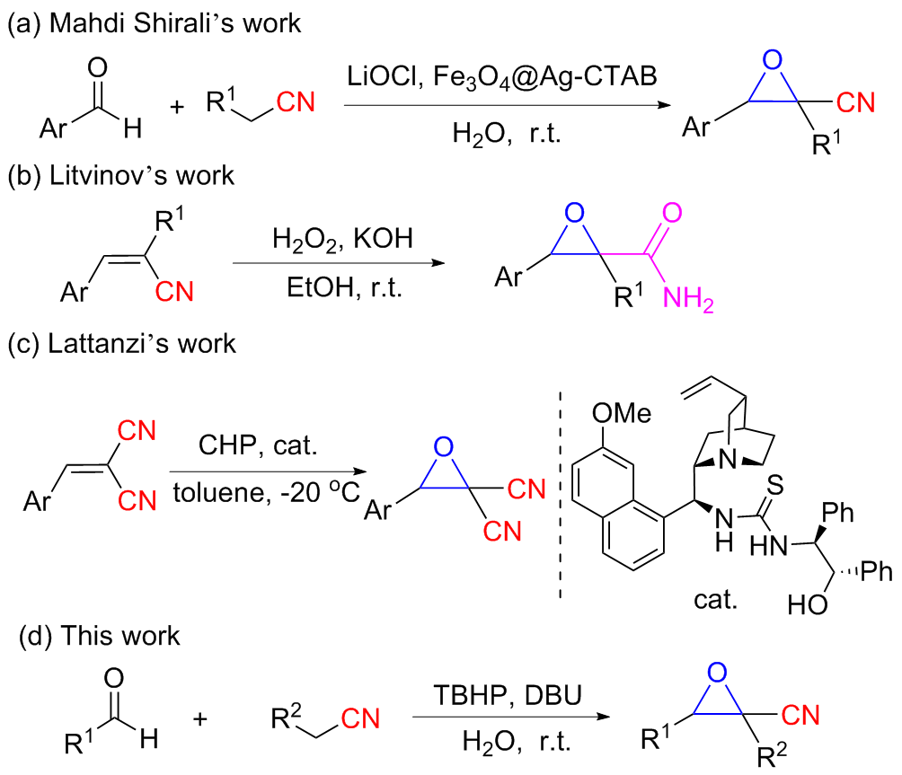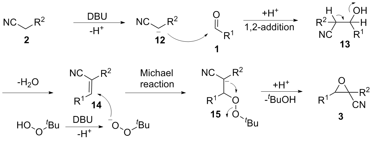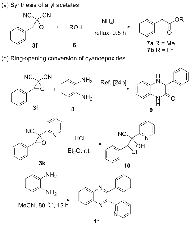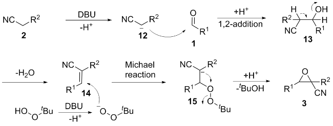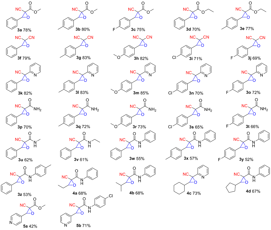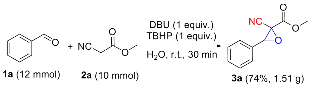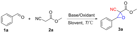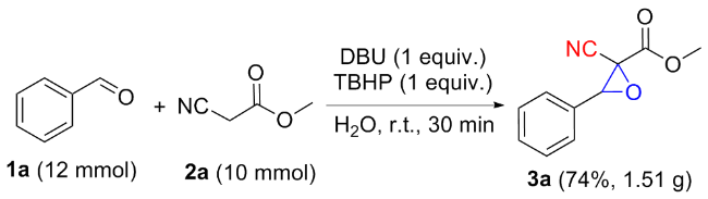 以2-氰基-3-苯基环氧乙烷-2-羧酸甲酯(3a)的合成为例. 在10 mL干燥的圆底烧瓶中加入磁力搅拌子, 依次加入H2O (5 mL)、DBU (1 mmol)、苯甲醛(1.2 mmol)、氰基乙酸甲酯(1 mmol)和叔丁醇过氧化氢(1 mmol), 在室温条件下搅拌反应30 min, 薄层色谱(TLC)监测至反应完成. 向反应混合物中依次加入乙酸乙酯萃取(30 mL×3), 再用水进行洗涤(30 mL×3), 收集有机相后减压除去溶剂, 粗产物以石油醚/乙酸乙酯(V∶V=15∶1)为洗脱液进行柱层析纯化, 得到2-氰基-3-苯基环氧乙烷-2-羧酸甲酯(3a), 白色固体, 产率78% (159 mg). m.p. 77.3~78.9 ℃; 1H NMR (400 MHz, DMSO-d6) δ: 8.05~7.99 (m, 1H), 7.83 (s, 1H), 7.46~7.41 (m, 2H), 7.07~7.02 (m, 2H), 4.71 (s, 1H), 3.80 (s, 3H); 13C NMR (100 MHz, DMSO-d6) δ: 164.10, 160.92, 128.59, 123.05, 115.00, 114.55, 63.63, 56.11, 55.72; HRMS (TOF ES+) calcd for C11H10NO3 [M+H]+ 204.0655, found 204.0661.
