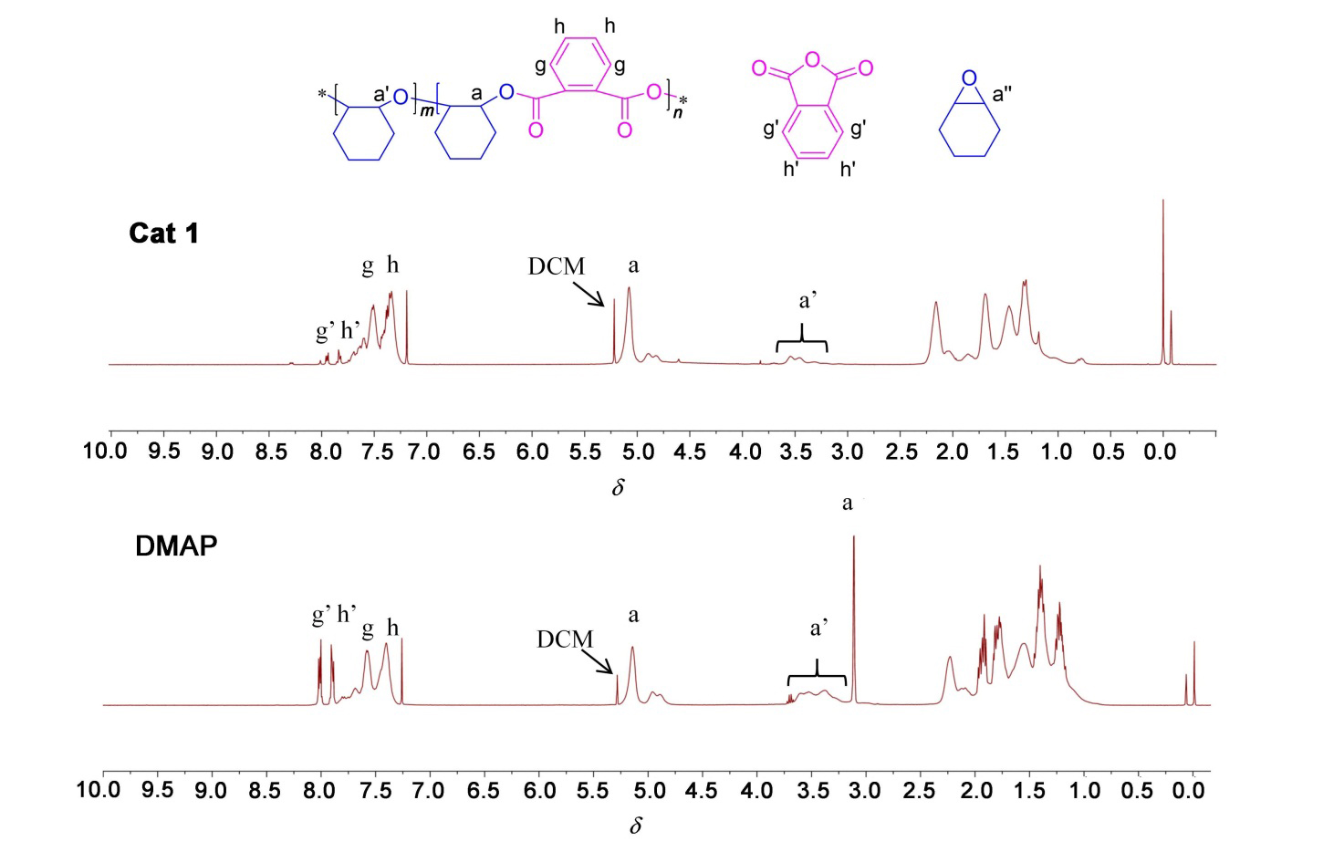 a Temperature: 100 ℃, time: 10 h, Cat 1 (0.1 mol%), DMAP (0.2 mol%), n(epoxide)∶n(anhydride)=2∶1, isolated yields are given, determined by gel permeation chromatography (GPC) in THF. b Temperature: 100 ℃, time: 24 h. |