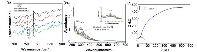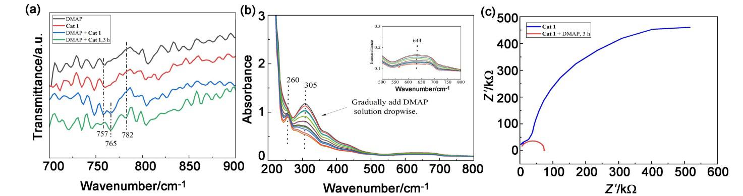 图8 环氧化物和酸酐共聚的机理探索: (a)向配合物Cat 1的二氯甲烷溶液中加入DMAP的FT-IR光谱; (b)向配合物Cat 1的二氯甲烷溶液中加入DMAP的UV-vis光谱; (c) Cat 1的二氯甲烷溶液中加入DMAP的电化学阻抗谱(EIS)Figure 8 Mechanism exploration of copolymerization of epoxides and anhydrides: (a) FT-IR spectra with addition of DMAP to a solution of complex Cat 1 in dichloromethane; (b) UV-vis spectra with addition of DMAP to a solution of complex Cat 1 in dichloromethane; (c) electrochemical impedance spectroscopy (EIS) of DMAP added to dichloromethane solution of Cat 1 |