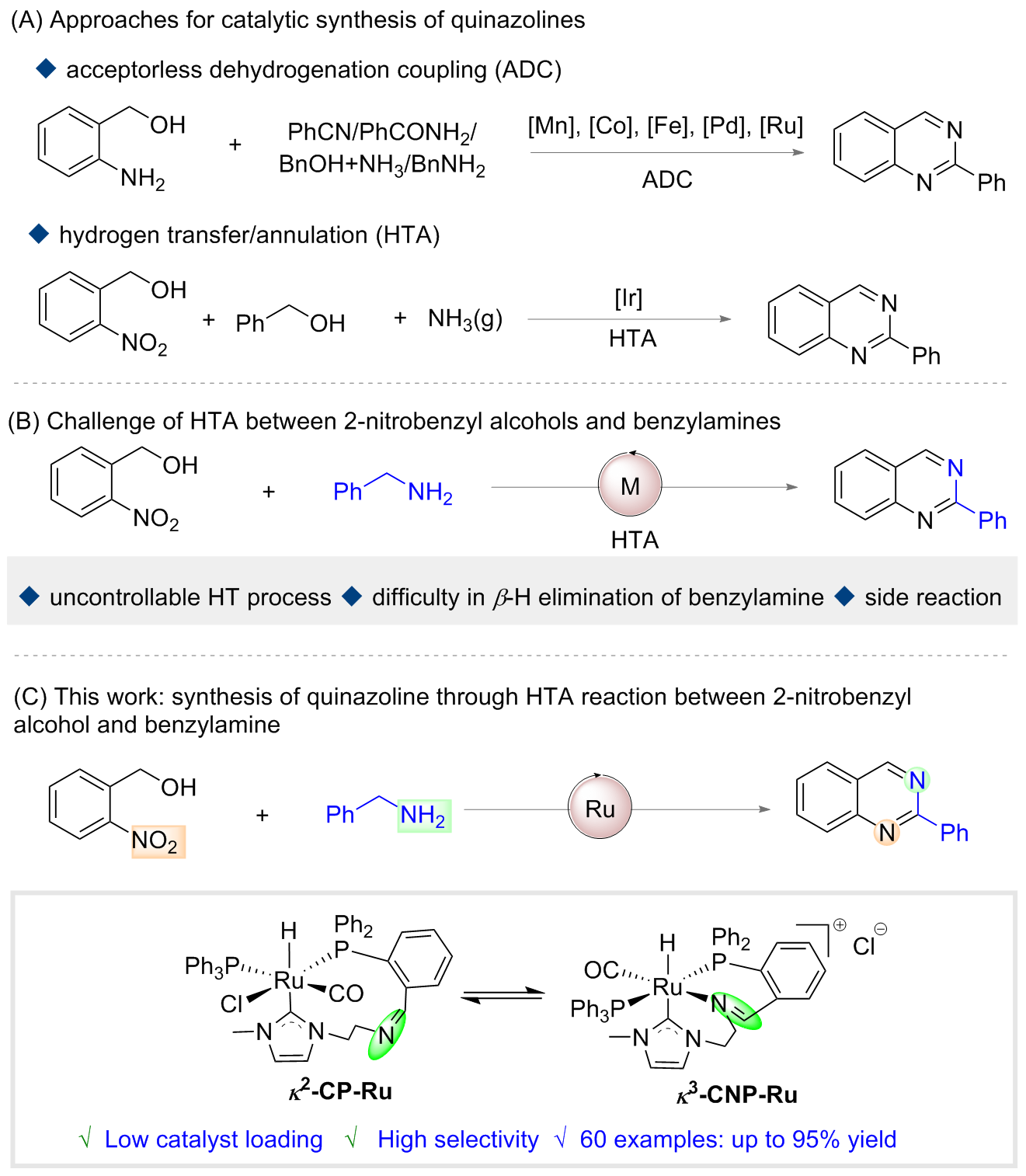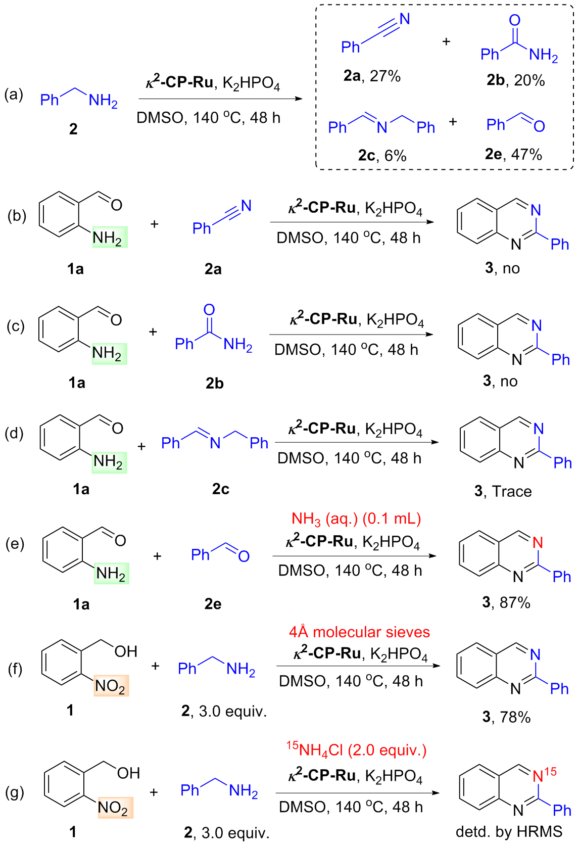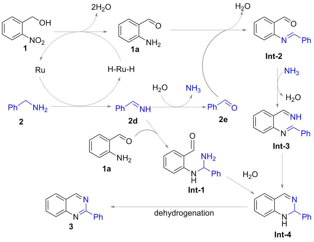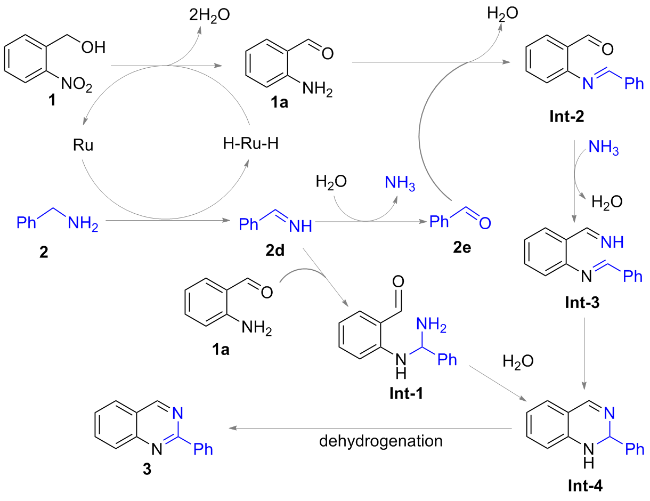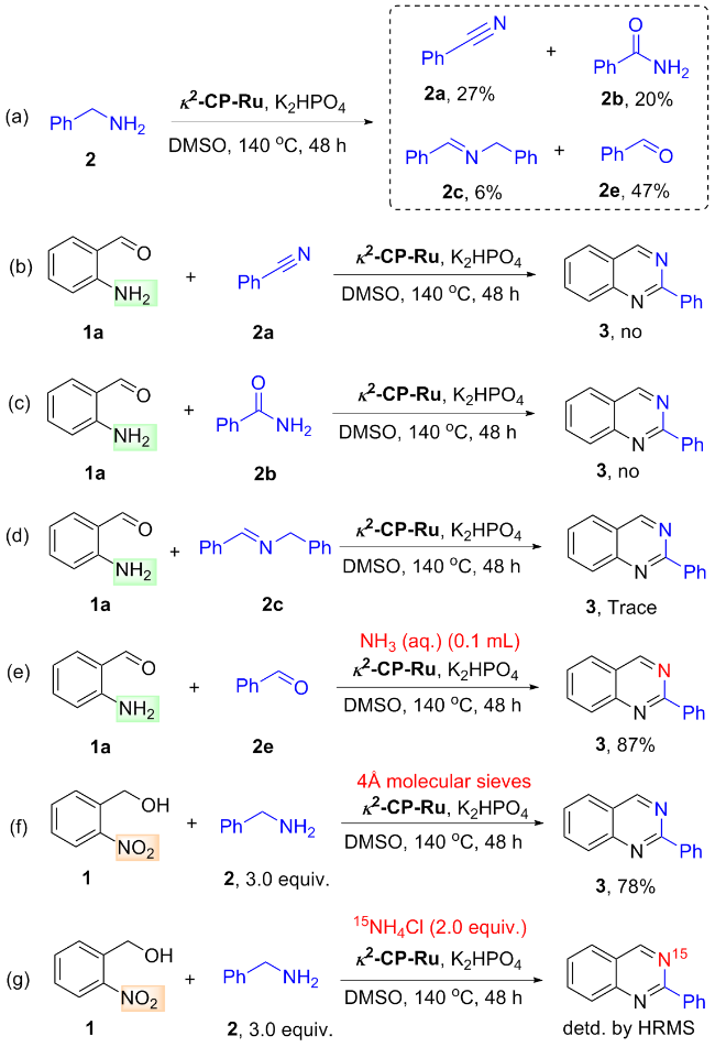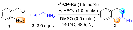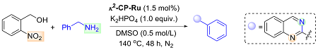 2-Nitrobenzyl alcohol (0.5 mmol), κ2-CP-Ru (1.5 mmol%, 6.3 mg) and K2HPO4 (0.5 mmol, 87 mg) were added into an oven-dried Schlenk tube equipped with a N2 balloon, and it was subject to three cycles of vacuum and refilled with nitrogen. Then another alcohol (1.5 mmol) and 1 mL of PhCl were sequentially injected and the mixture was stirred at 140 ℃. After reacting 48 h, the mixture was filtered, and the sample was washed with dichloromethane. The crude residue was purified by flash column chromatography [unless mentioned otherwise, the mixture of petroleum (PE)/ethyl acetate (EA) with V∶V=30∶1 was used as eluent) to obtain the pure product.