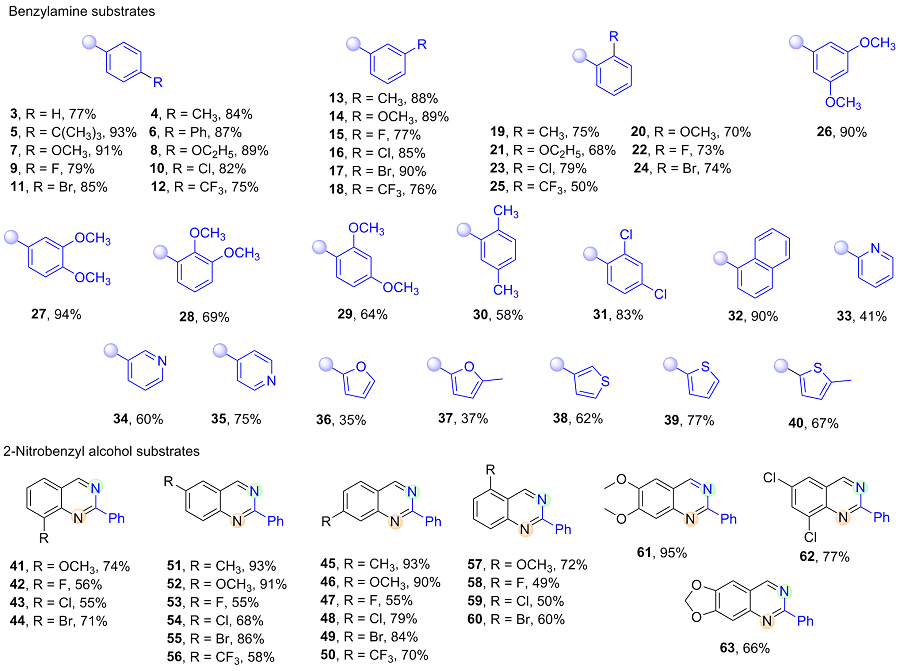 6,7-Dimethoxy-2-phenylquinazoline (61): Light yellow solid, 126 mg, 95% yield. m.p. 176~178 ℃; 1H NMR (400 MHz, CDCl3) δ: 9.23 (s, 1H), 8.65~8.45 (m, 2H), 7.61~7.45 (m, 3H), 7.39 (s, 1H), 7.11 (s, 1H), 4.09 (s, 3H), 4.05 (s, 3H); 13C NMR (101 MHz, CDCl3) δ: 159.9, 157.1, 156.2, 150.3, 148.6, 138.3, 130.1, 128.5, 128.1, 119.4, 106.8, 103.9, 56.4, 56.2; HRMS (ESI+) calcd for C16H15N2O2 [M+H]+ 267.1128, found 267.1129.