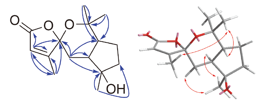 1 was characterized as a rare sesquiterpene featuring a unique spiro-heterocyclic skeleton. The NOESY correlations of 15-CH
