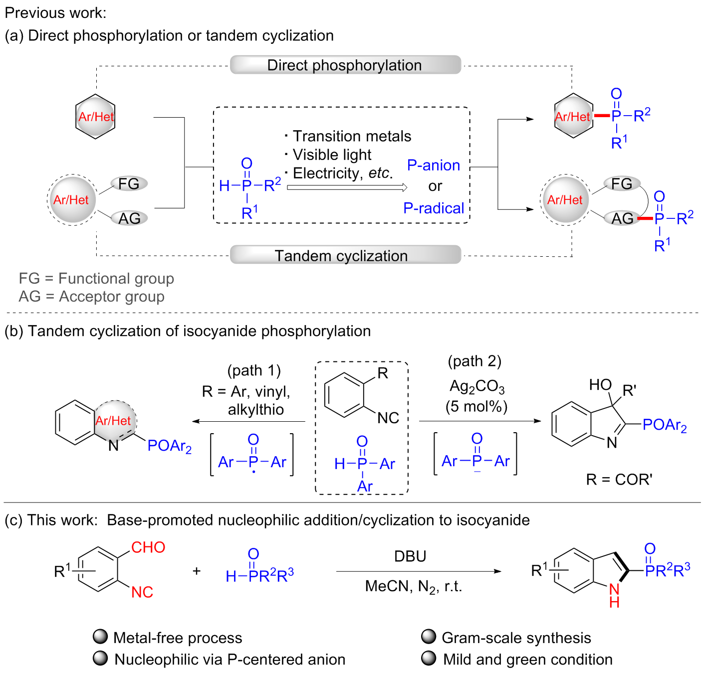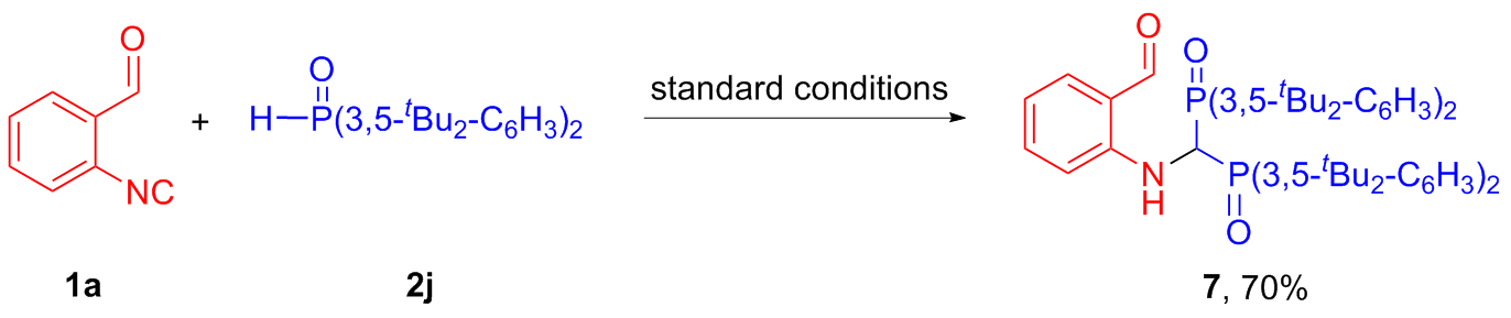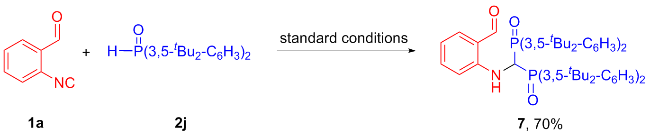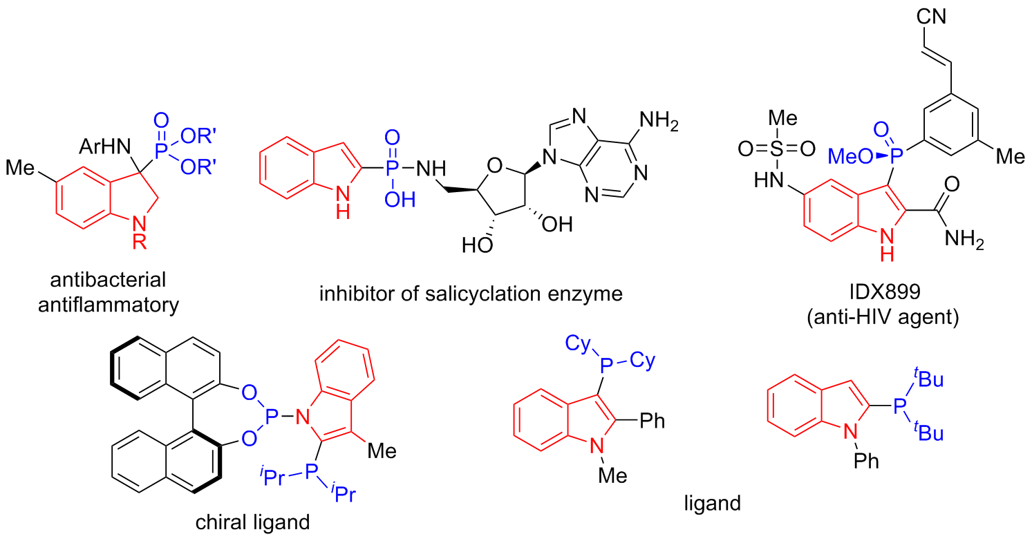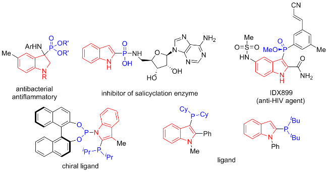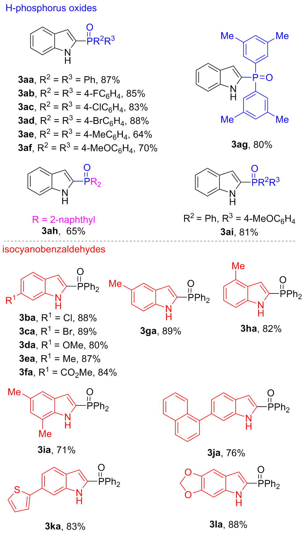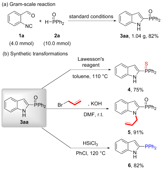(1H-Indol-2-yl)di(naphthalen-2-yl)phosphine oxide (3ah): White solid, 64% yield. m.p.>288 ℃; 1H NMR (400 MHz, DMSO-d6) δ: 11.99 (s, 1H), 8.45 (d, J=14.2 Hz, 2H), 8.11~8.07 (m, 5H), 8.02 (d, J=8.1 Hz, 2H), 7.78~7.73 (m, 2H), 7.70~7.60 (m, 5H), 7.45 (d, J=8.2 Hz, 1H), 7.23 (t, J=7.4 Hz, 1H), 7.07 (t, J=7.5 Hz, 1H), 6.76 (s, 1H); 13C NMR (101 MHz, DMSO-d6) δ: 139.3 (d, J=9.6 Hz), 134.4 (d, J=2.3 Hz), 133.0 (d, J=9.8 Hz), 132.1 (d, J=13.4 Hz), 130.5, 130.0, 129.4, 128.8 (d, J=49.6 Hz), 128.7, 128.4, 127.5 (d, J=63.2 Hz), 126.7, 126.5 (d, J=11.0 Hz), 124.0, 121.6, 120.0, 112.7 (d, J=15.2 Hz), 112.4; 31P NMR (162 MHz, DMSO-d6) δ: 17.58; HRMS (ESI) calcd for C28H20- NOPNa [M+Na]+ 440.1175, found 440.1184.