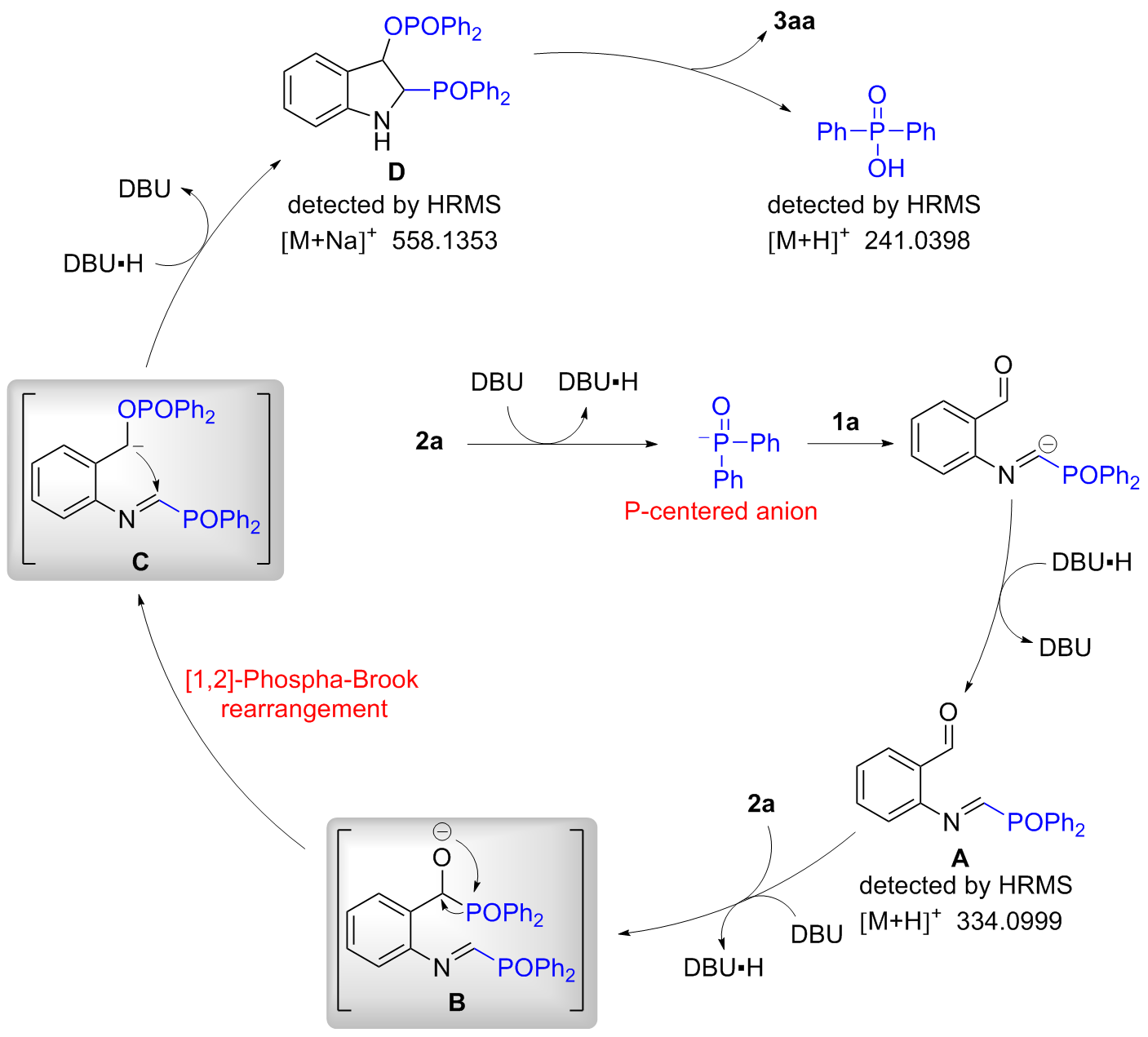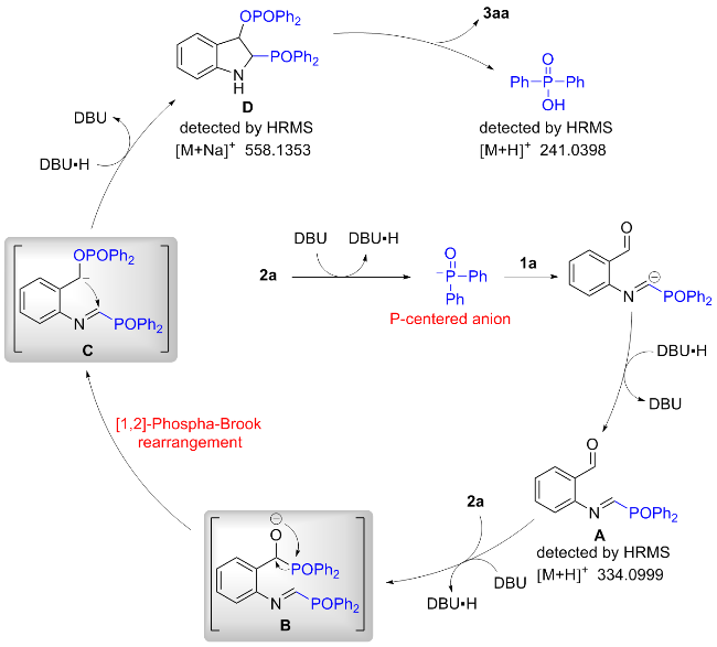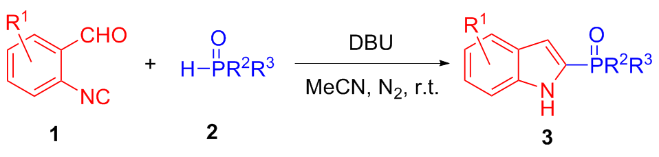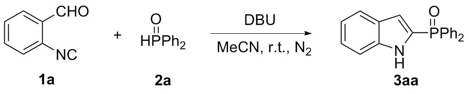 In a flame-dried 10.0 mL Schlenk tube equipped with a magnetic stir bar was charged sequentially with 1a (0.2 mmol, 1.0 equiv.) and 2a (0.5 mmol, 2.5 equiv.), followed by the addition of anhydrous MeCN (1.0 mL). To the resulting mixture was added DBU (0.5 mmol, 2.5 equiv.) under nitrogen atmosphere. Then the mixture was stirred at room temperature for 12 h under nitrogen atmosphere until the reaction was completed, as monitored by TLC analysis. The residue was purified by silica gel chromatography with petroleum ether/ethyl acetate (V∶V=1∶1) to afford 2-phosphinoyl indoles 3aa (87% yield). Compounds 3ab~3la were prepared through the same procedure.