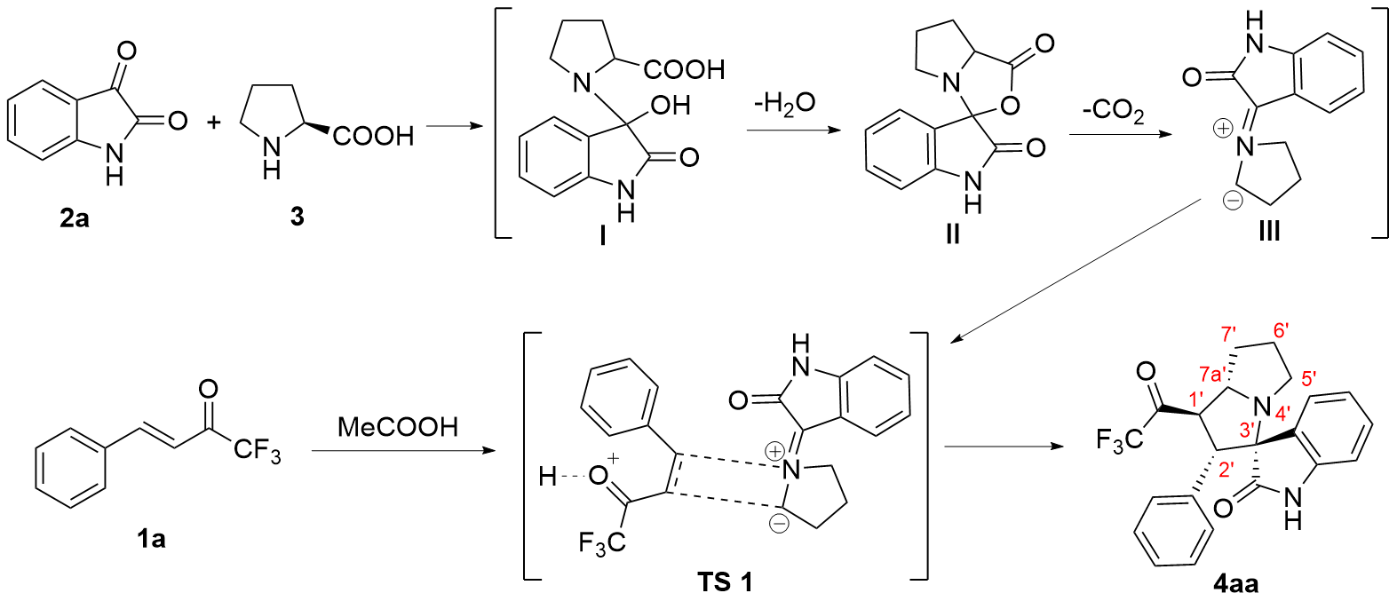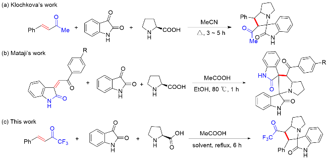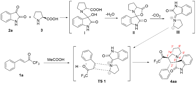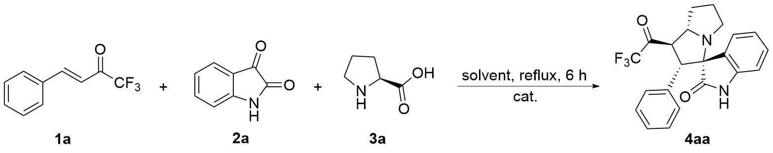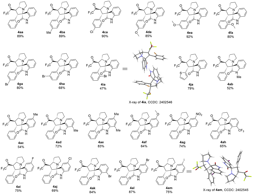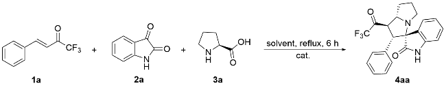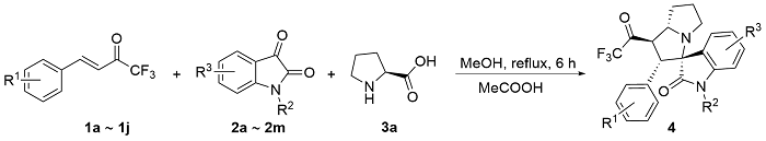 以2'-苯基-1'-(2,2,2-三氟乙酰基)-1',2',5',6',7',7a'-六氢螺[吲哚啉-3,3'-吡咯里嗪]-2-酮(4aa)为例. 将三氟甲基酮2a (0.2 mmol, 40 mg)、靛红(0.32 mmol, 47 mg)、L-脯氨酸(0.4 mmol, 46 mg)加入25 mL反应管中, 加入4 mL甲醇搅拌5 min, 然后加入冰乙酸(0.5 mmol, 3 μL), 回流6 h至薄层色谱(TLC)监测三氟甲基酮消失, 将反应液通过硅藻土过滤, 乙酸乙酯洗涤滤饼, 浓缩后快速柱色谱分离[V(PE):V(EA)=5:1], 得到目标产物2'-苯 基-1'-(2,2,2-三氟乙酰基)-1',2',5',6',7',7a'-六氢螺[吲哚 啉-3,3'-吡咯里嗪]-2-酮(4aa), 黄色固体, 35.6 mg, 产率89%. m.p. 87.1 ℃; 1H NMR (400 MHz, Chloroform-d) δ: 8.78 (s, 1H), 7.49 (d, J=7.2 Hz, 1H), 7.15 (t, J=7.0 Hz, 1H), 7.10 (d, J=7.2 Hz, 1H), 7.04 (d, J=7.2 Hz, 1H), 6.97 (t, J=7.4 Hz, 2H), 6.87 (d, J=7.2 Hz, 2H), 6.51 (d, J=7.4 Hz, 1H), 4.78 (dd, J=12.0, 8.0 Hz, 1H), 4.40 (d, J=12.0 Hz, 1H), 3.93 (q, J=8.0 Hz, 1H), 2.71 (t, J=8.4 Hz, 1H), 2.56 (td, J=9.8, 6.4 Hz, 1H), 2.13 (h, J=5.0, 4.4 Hz, 3H), 1.87 (tt, J=12.8, 6.2 Hz, 1H); 13C NMR (101 MHz, Chloroform-d) δ: 191.5 (q, J=36.0 Hz), 179.2, 140.8, 132.8, 129.6, 129.2, 128.1, 128.0, 127.7, 124.3, 123.2, 115.5 (q, J=291.7 Hz), 109.8, 77.6, 69.1, 60.3, 51.4, 48.1, 32.2, 28.8; 19F NMR (376 MHz, Chloroform-d) δ: -77.14; IR (KBr) ν: 3198.7 (NH stretching vibration), 2966.8, 2870.8, 1756.5 (C=O), 1707.4 (C=O), 1620.3 (NH deformation vibration), 1472.0, 1258.8, 1202.7, 1149.5, 1061.2, 1014.0, 946.4, 844.7, 752.6, 741.0 cm-1; HRMS (ESI) calcd for C22H20F3N2O2 (M+H)+ 401.1472, found 401.1471.