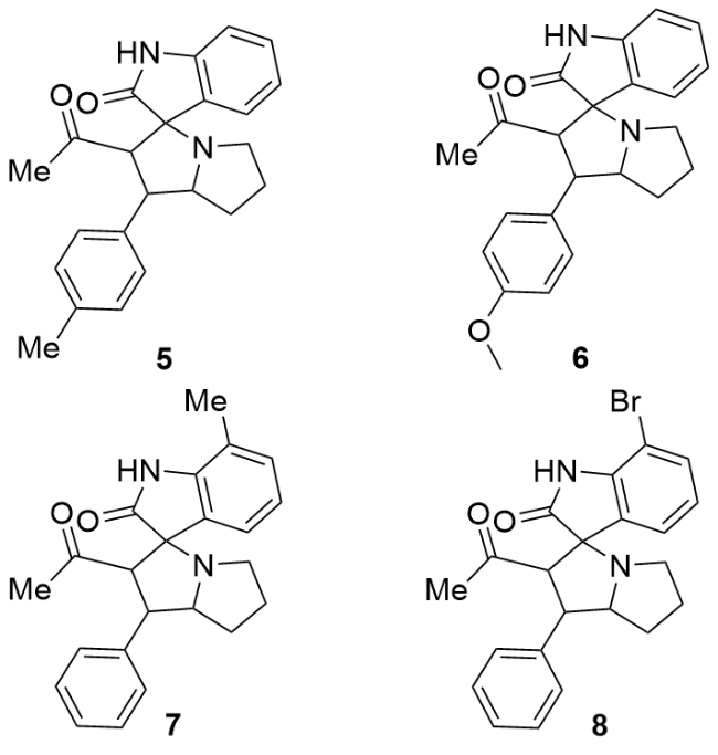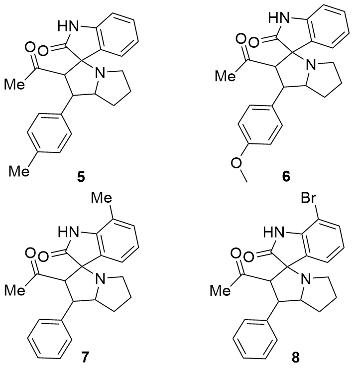 2'-(2-溴苯基)-1'-(2,2,2-三氟乙酰基)-1',2',5',6',7',7a'-六氢螺[吲哚啉-3,3'-吡咯里嗪]-2-酮(4ia): 白色固体, 22.5 mg, 产率47%. m.p. 115.4 ℃; 1H NMR (400 MHz, Chloroform-d) δ: 8.17 (s, 1H), 7.65 (d, J=7.2 Hz, 1H), 7.55 (d, J=8.0 Hz, 1H), 7.30 (d, J=8.0 Hz, 1H), 7.16 (t, J=7.2 Hz, 1H), 7.06 (dt, J=11.2, 7.6 Hz, 2H), 6.94 (t, J=7.6 Hz, 1H), 6.58 (d, J=7.6 Hz, 1H), 5.26 (d, J=12.0 Hz, 1H), 4.66 (dd, J=12.0, 8.2 Hz, 1H), 3.98 (q, J=7.8 Hz, 1H), 2.74 (t, J=8.0 Hz, 1H), 2.60 (td, J=9.2, 6.2 Hz, 1H), 2.21~2.10 (m, 3H), 1.94 (dt, J=15.6, 7.4 Hz, 1H); 13C NMR (101 MHz, Chloroform-d) δ: 191.0 (q, J=36.1 Hz), 179.5, 140.1, 133.3, 132.6, 129.4, 129.3, 128.8, 128.2, 127.4, 126.7, 126.3, 122.7, 115.4 (q, J=291.6 Hz), 109.3, 77.3, 68.7, 56.4, 53.7, 47.7, 32.1, 29.0; 19F NMR (376 MHz, Chloroform-d) δ: -77.23; IR (KBr) ν: 3415.8 (NH stretching vibration), 2964.1, 2869.8, 1756.5 (C=O), 1705.0 (C=O), 1621.2 (NH deformation vibration), 1472.1, 1437.7, 1259.5, 1203.3, 1149.8, 1028.1, 842.9, 746.9, 718.9 cm-1; HRMS (ESI) calcd for C22H19BrF3N2O2 (M+H)+ 479.0577, found 479.0577.